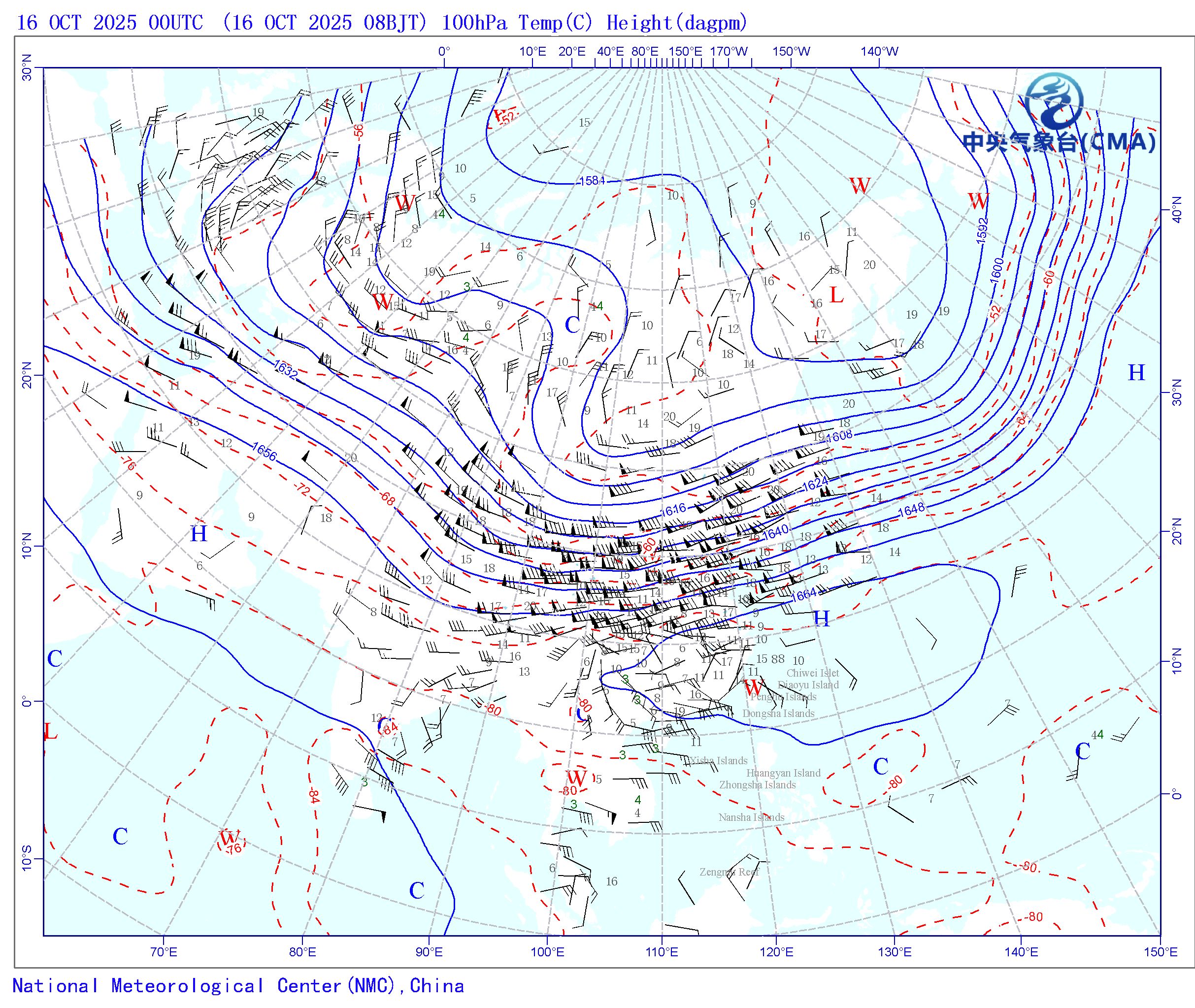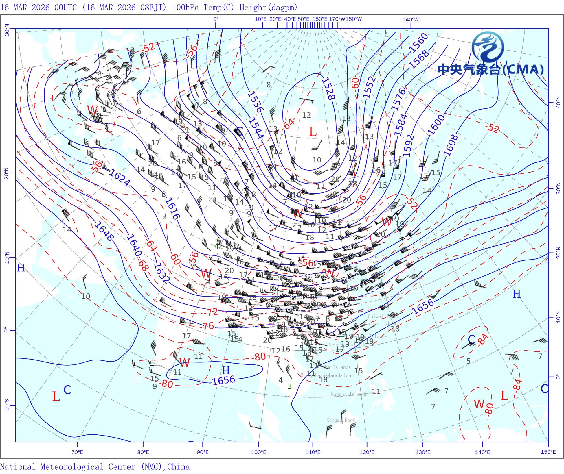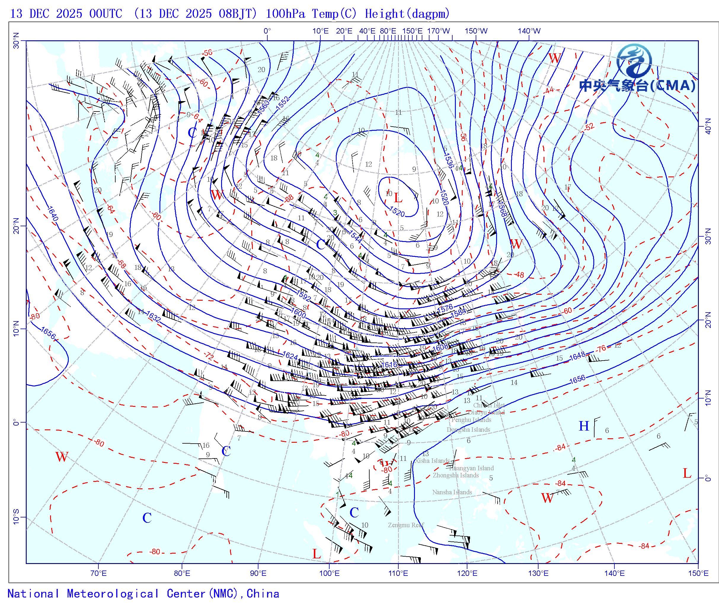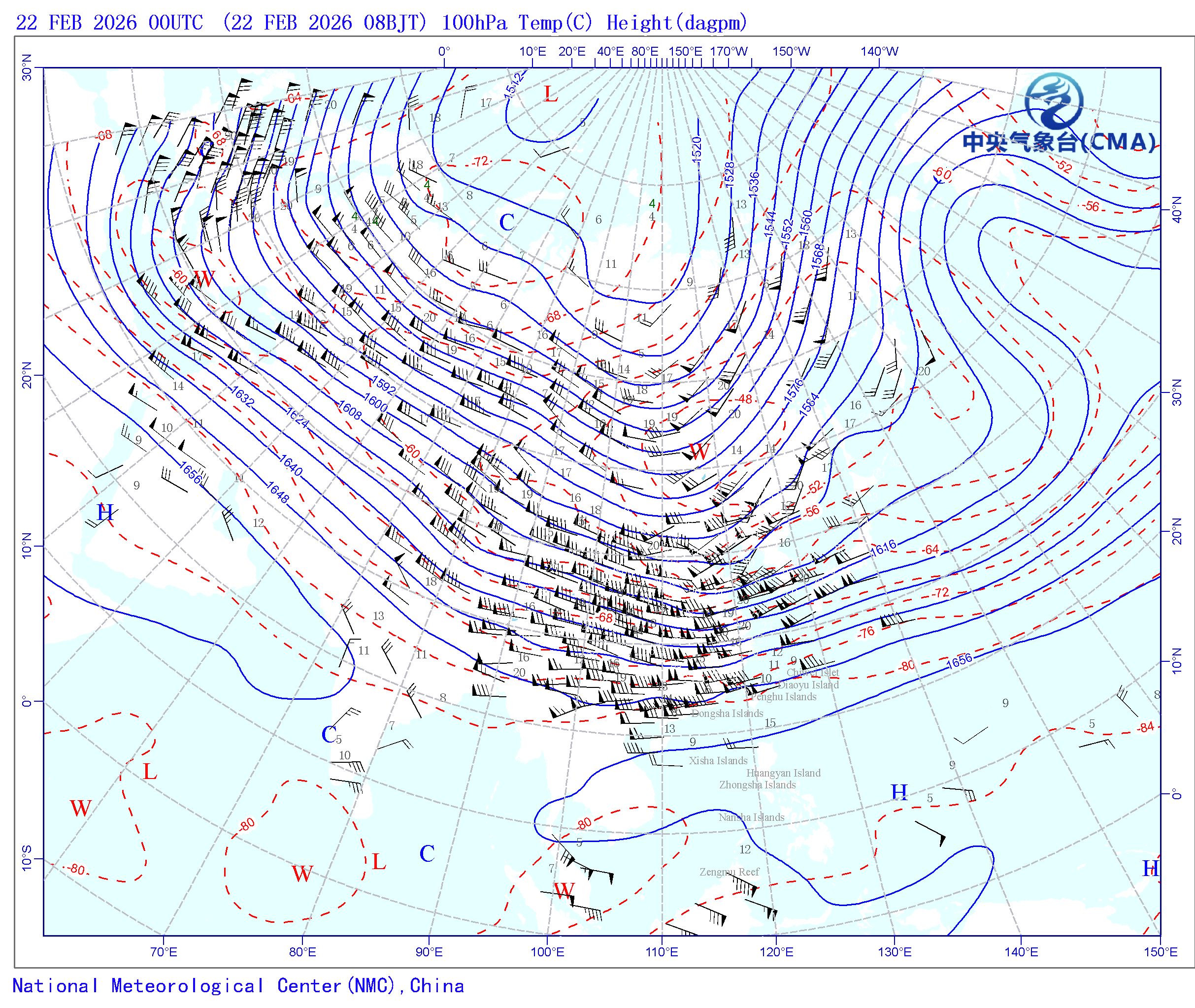 站点的填图要素包括:风向风速和温度露点差;天气系统符号包括:高压中心(H)、低压中心(L)、暖中心(W)、冷中心(C)和台风符号;蓝色等值线为等高线(单位dagpm);红色等值线为等温线(单位℃),其中零摄氏度以下以虚线显示。
