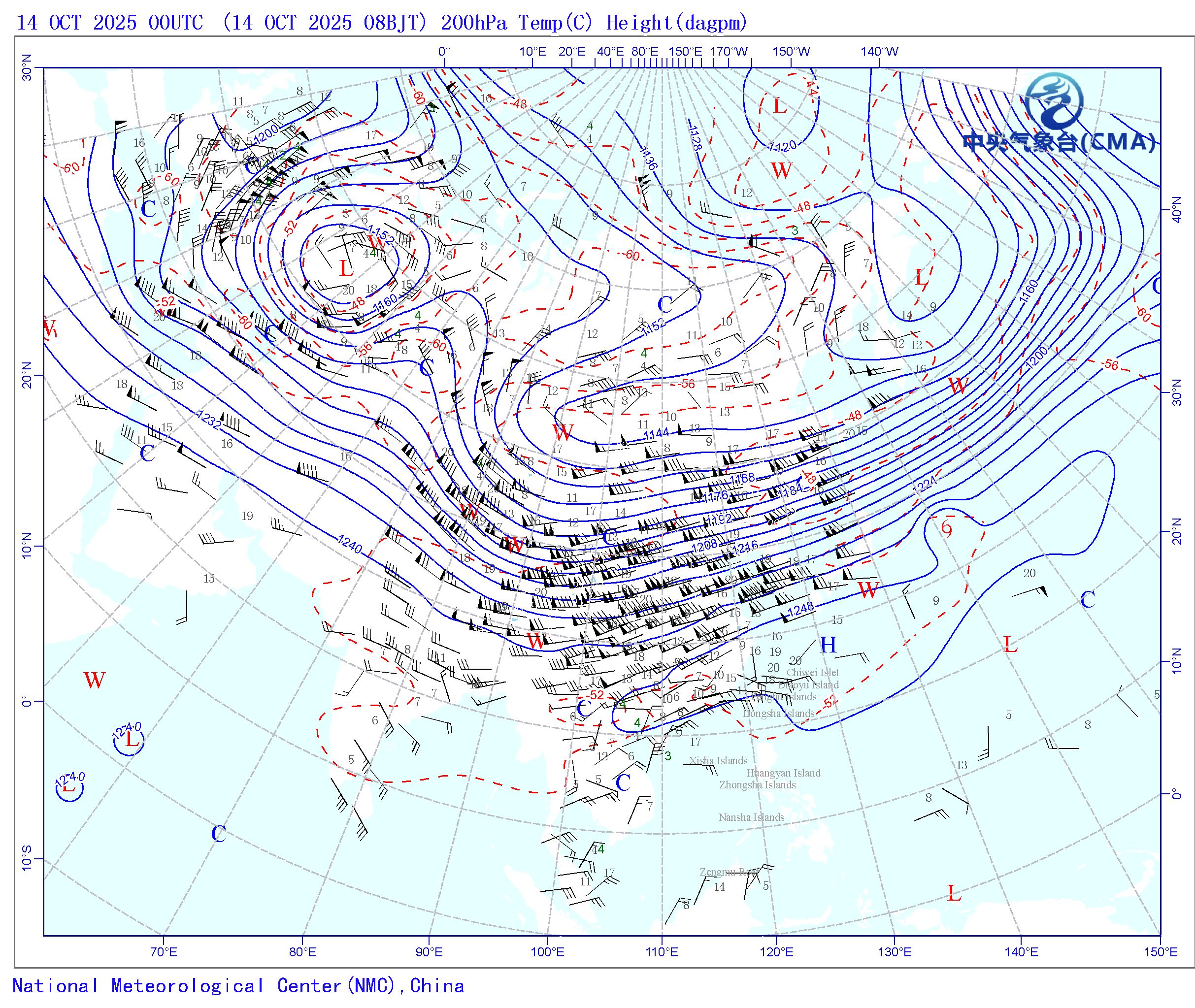 站点的填图要素包括:风向风速和温度露点差;天气系统符号包括:高压中心(H)、低压中心(L)、暖中心(W)、冷中心(C)和台风符号;蓝色等值线为等高线(单位dagpm);红色等值线为等温线(单位℃),其中零摄氏度以下以虚线显示。
