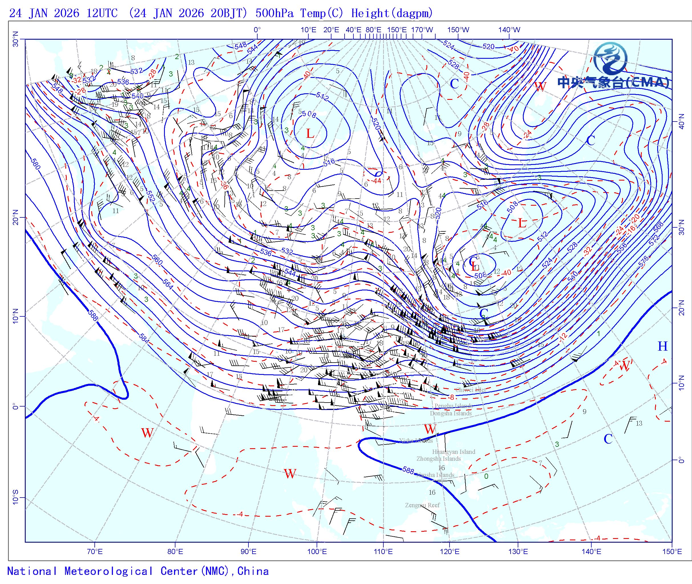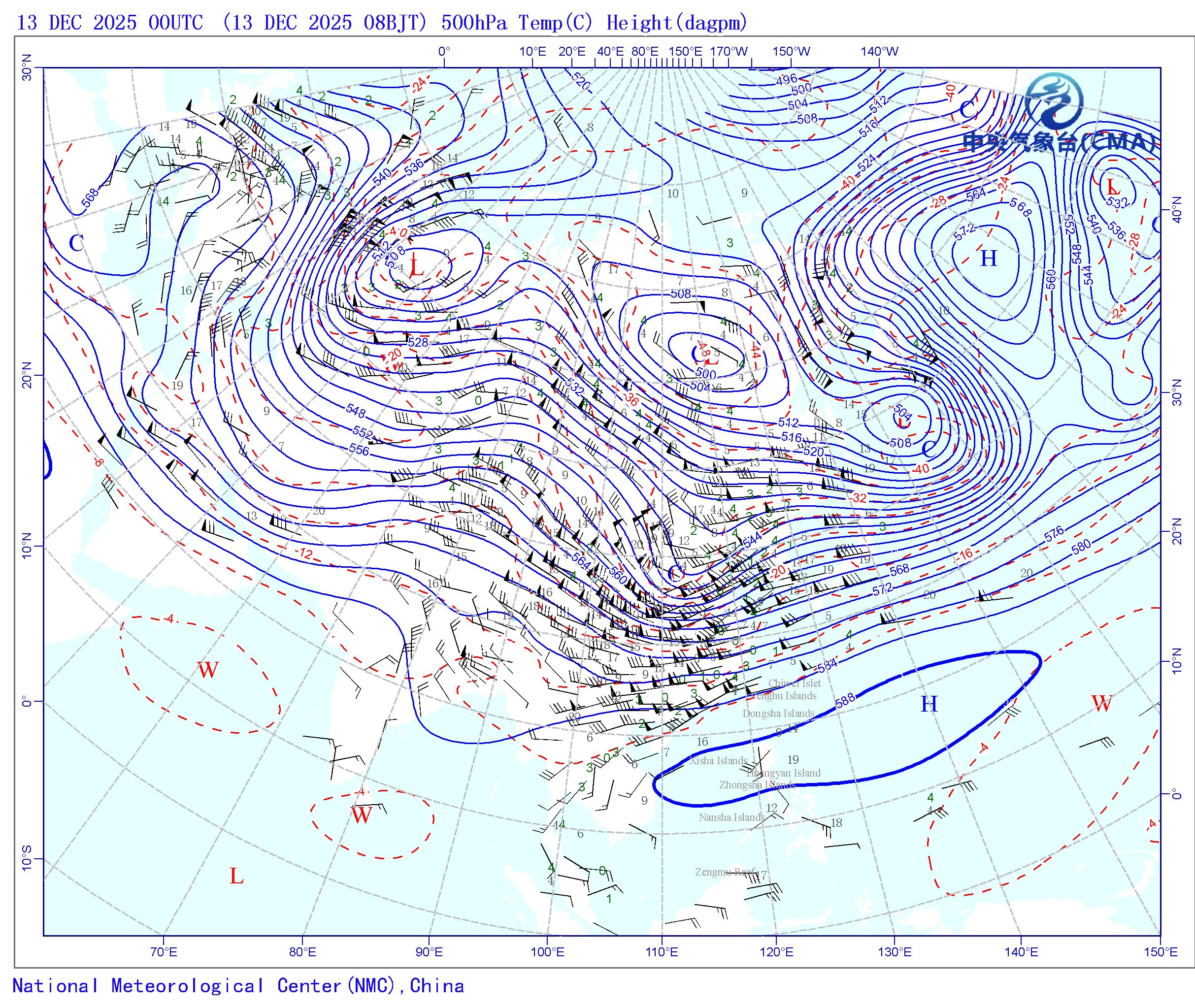 站点的填图要素包括:风向风速和温度露点差;天气系统符号包括:高压中心(H)、低压中心(L)、暖中心(W)、冷中心(C)和台风符号;蓝色等值线为等高线(单位dagpm);红色等值线为等温线(单位℃),其中零摄氏度以下以虚线显示。