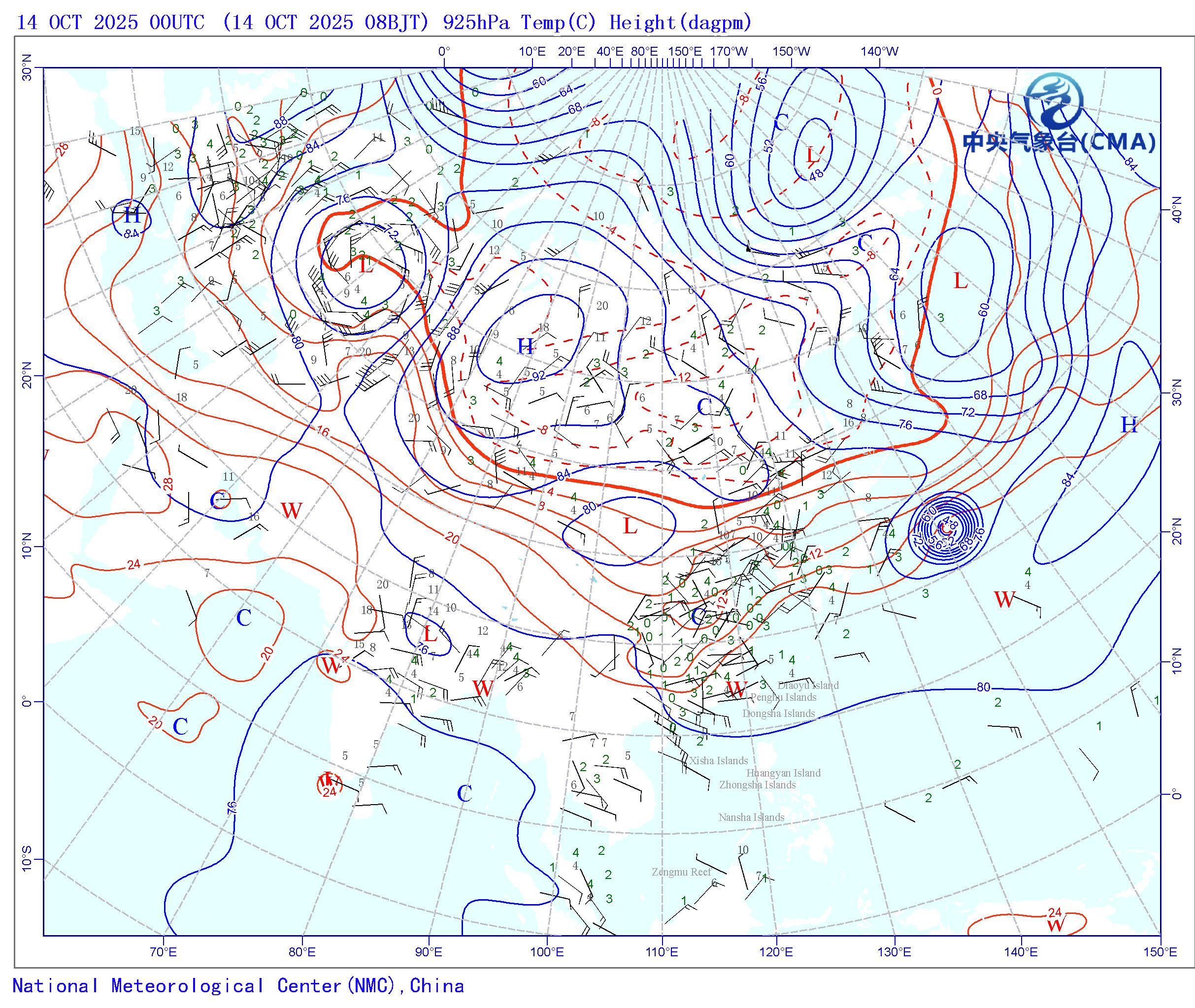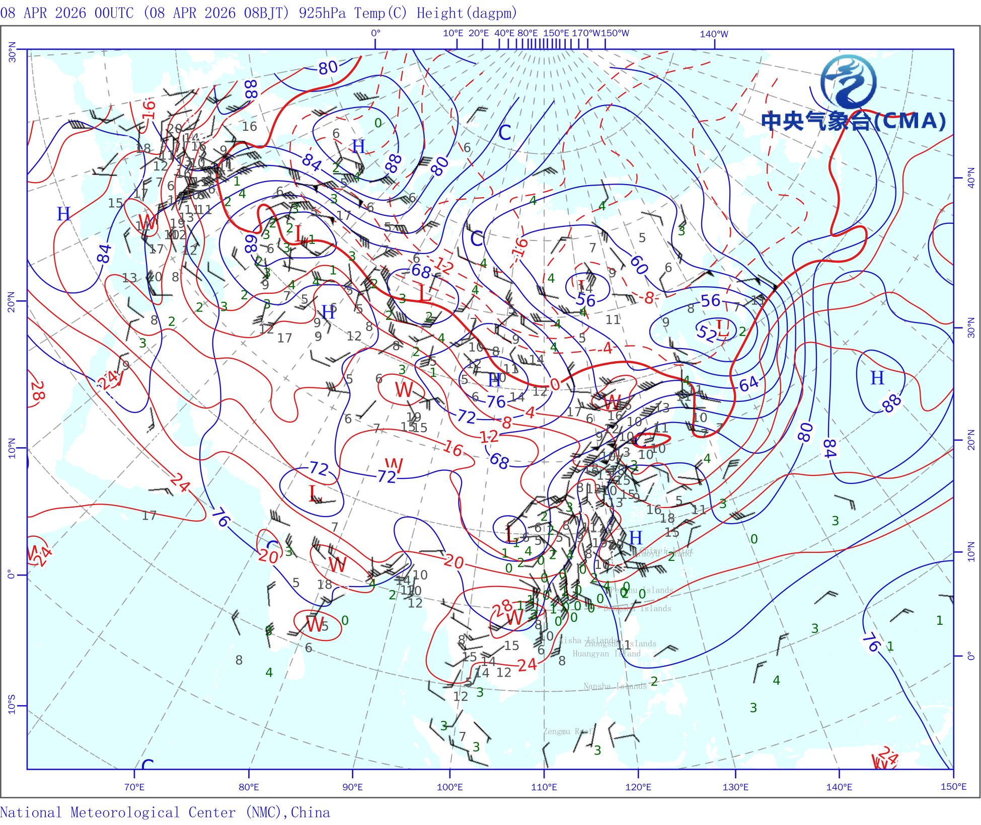 站点的填图要素包括:风向风速和温度露点差;天气系统符号包括:高压中心(H)、低压中心(L)、暖中心(W)、冷中心(C)和台风符号;蓝色等值线为等高线(单位dagpm);红色等值线为等温线(单位℃),其中零摄氏度以下以虚线显示。