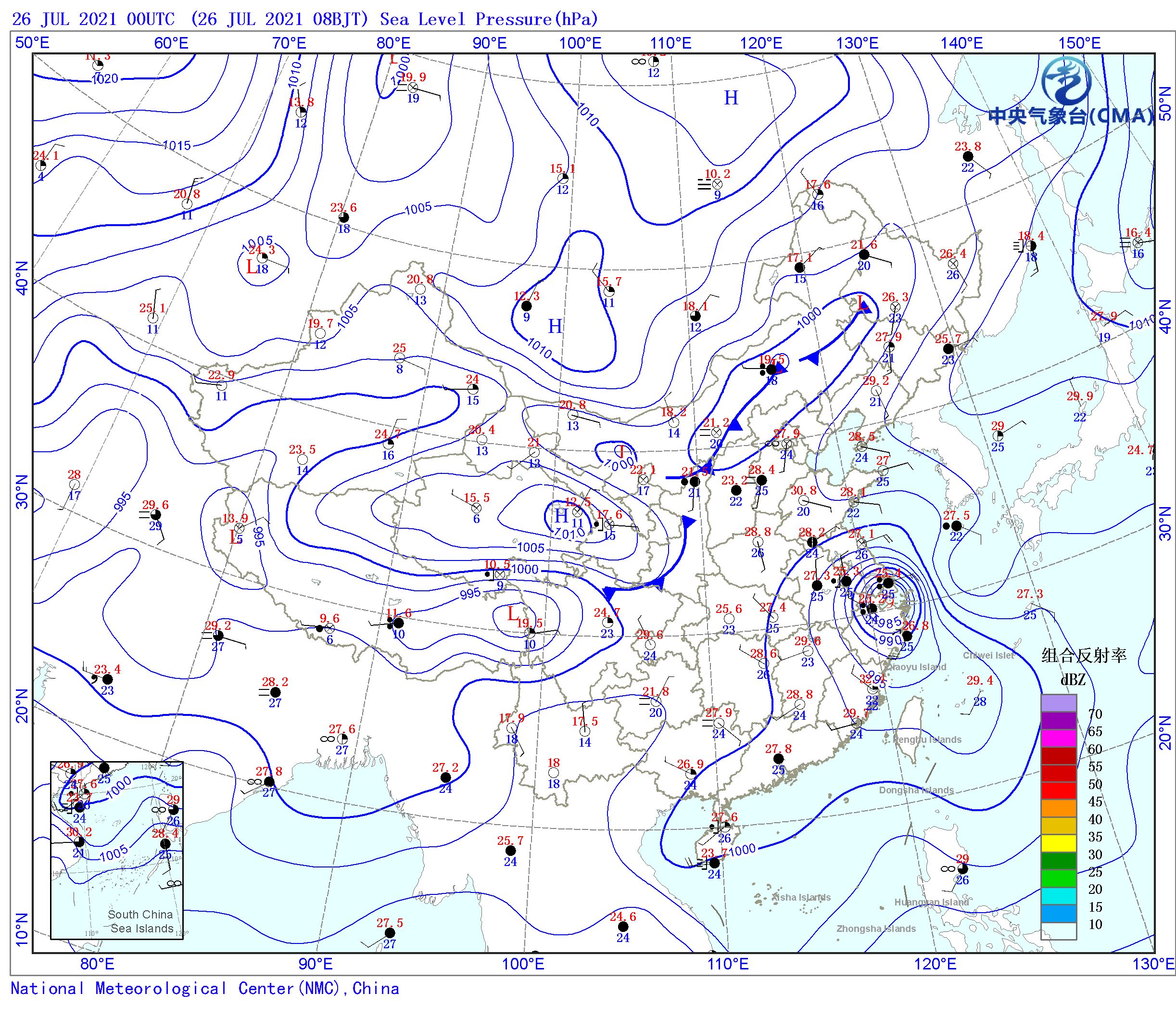 站点的填图要素包括:云量、风向风速、天气现象、温度(红色数字)和露点(蓝色数字);天气系统符号包括:高压中心(H)、低压中心(L)、冷锋(带三角形蓝色线段)、暖锋(带半圆形红色线段)和台风符号;蓝色等值线为海平面气压场等压线(单位hPa);底层填色为地形高度;顶层填色为雷达组合反射率因子拼图。
