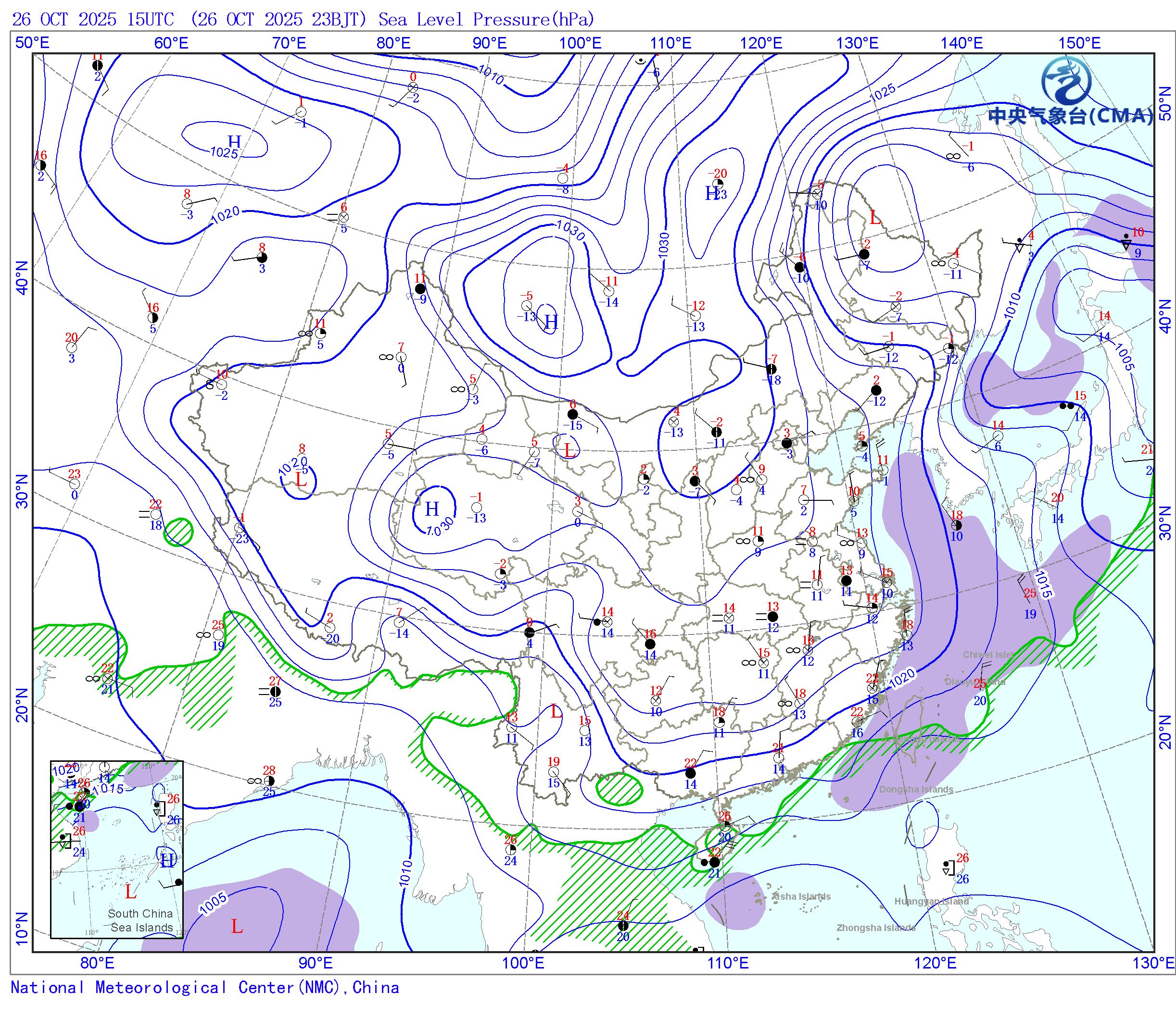 站点的填图要素包括:云量、风向风速、天气现象、温度(红色数字)和露点(蓝色数字);天气系统符号包括:高压中心(H)、低压中心(L)、冷锋(带三角形蓝色线段)、暖锋(带半圆形红色线段)和台风符号;蓝色等值线为海平面气压场等压线(单位hPa);紫色填充区为六级以上大风速区;绿色线条为等比湿线,其栅格化一侧为比湿达到15g/kg的区域;