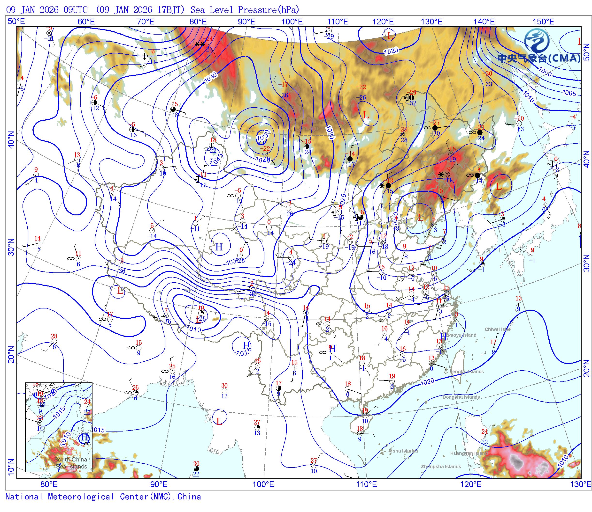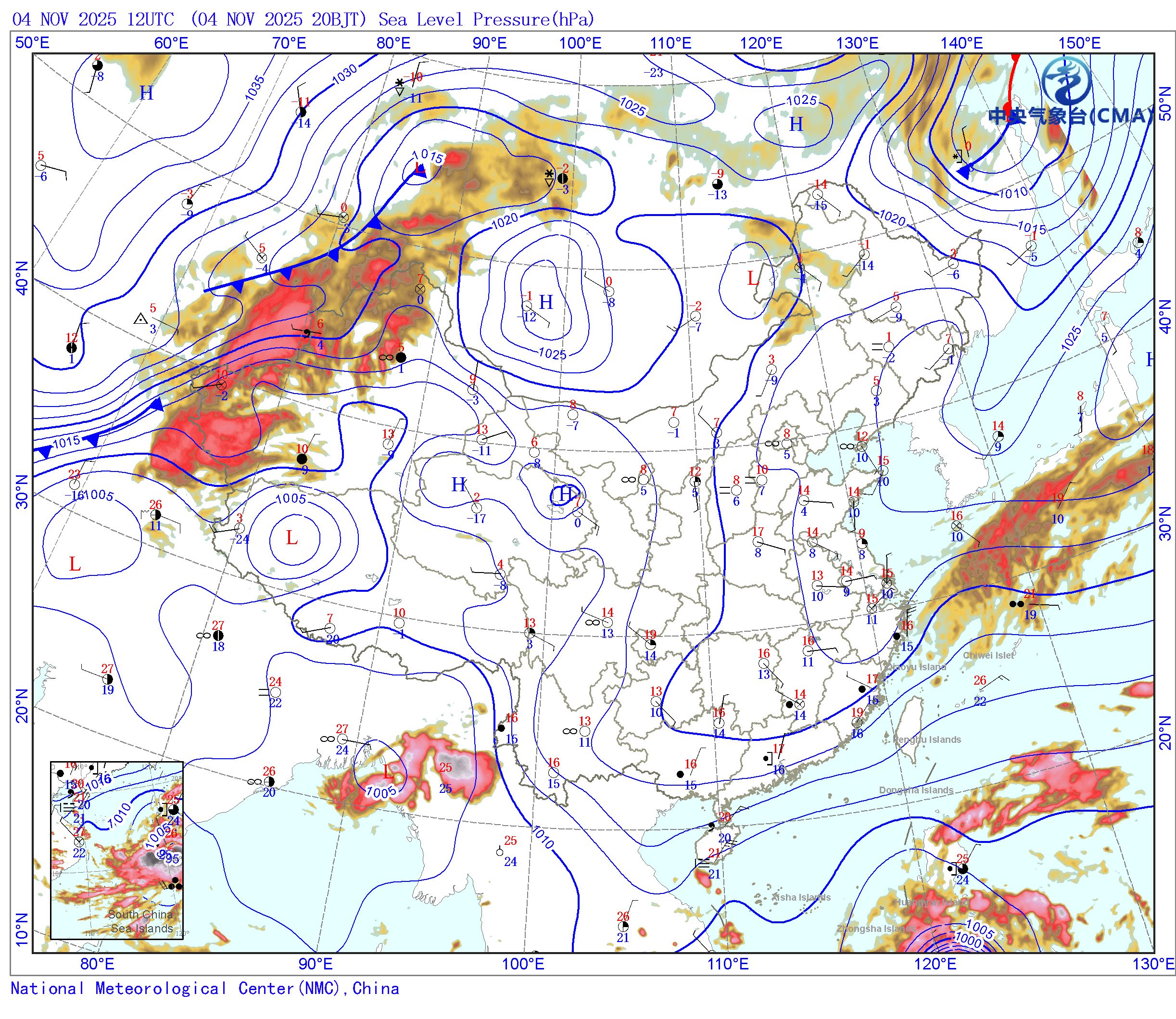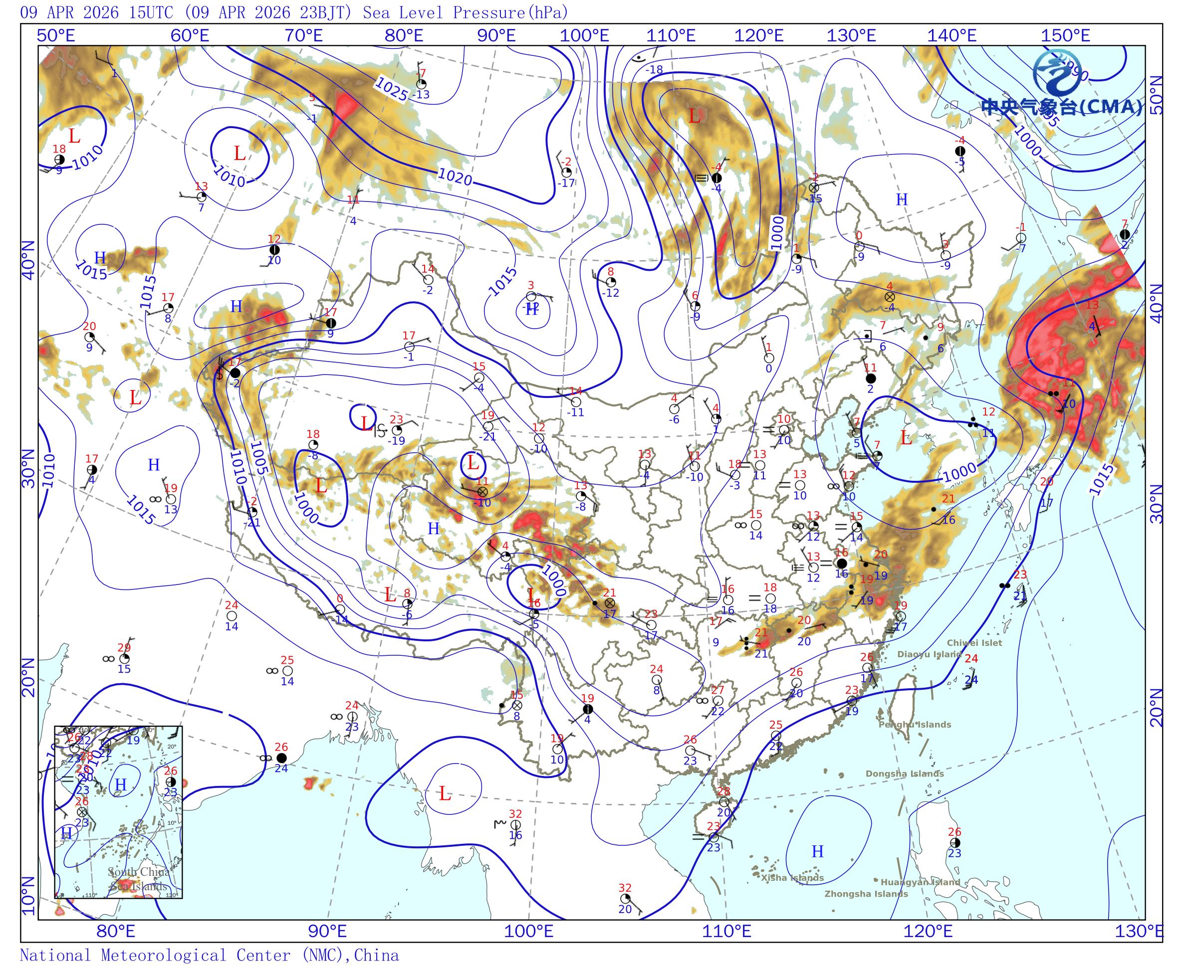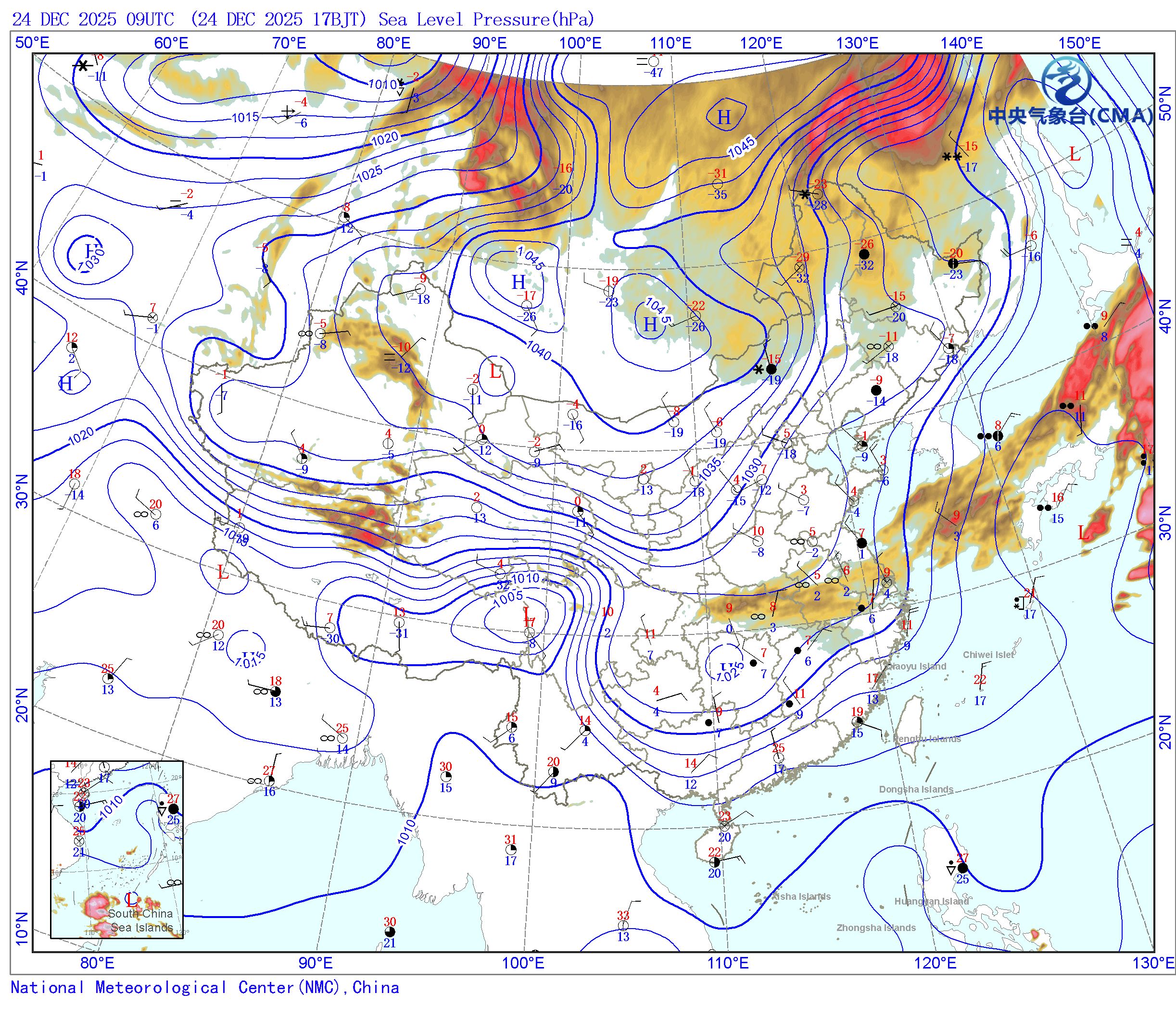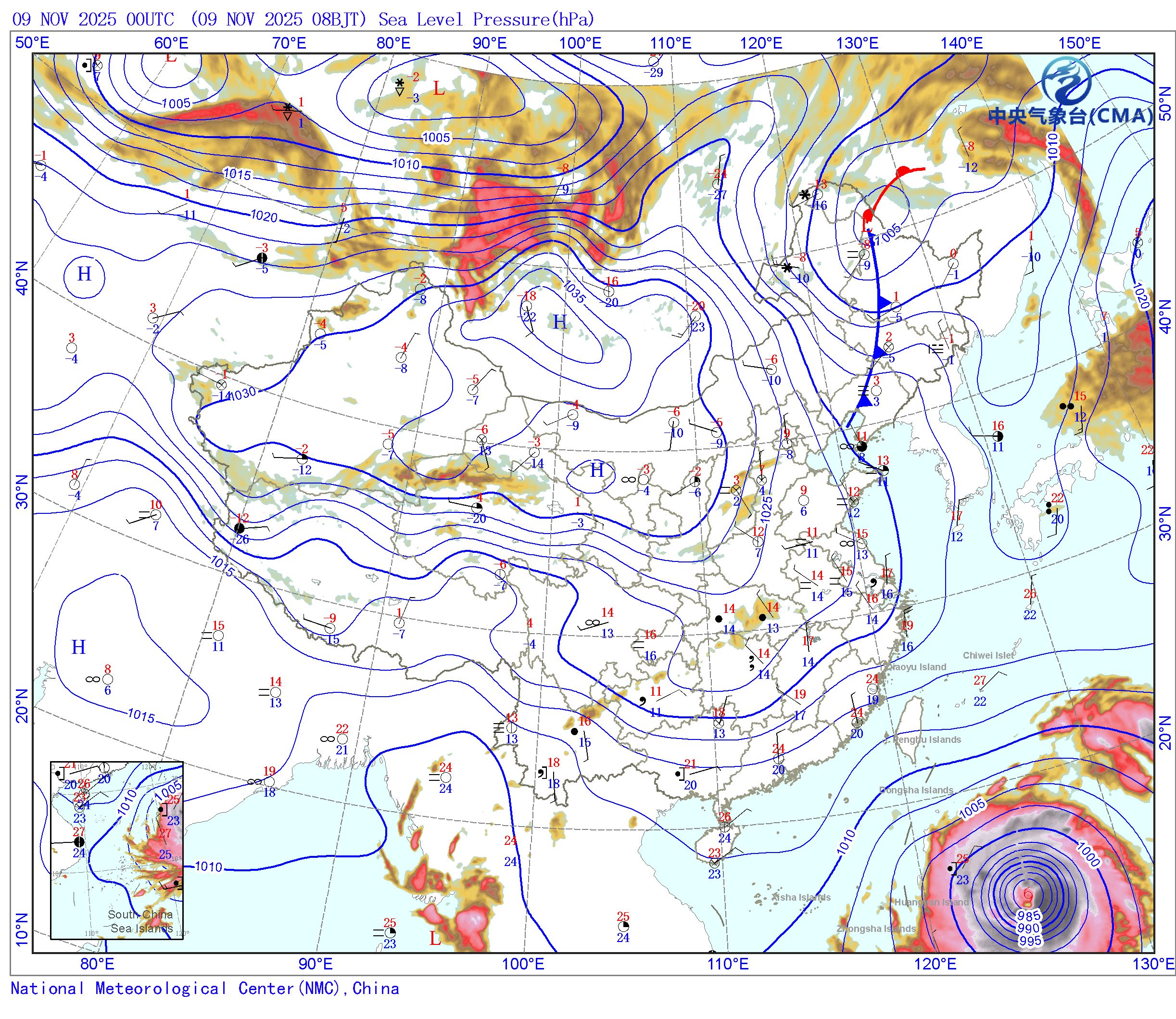 站点的填图要素包括:云量、风向风速、天气现象、温度(红色数字)和露点(蓝色数字);天气系统符号包括:高压中心(H)、低压中心(L)、冷锋(带三角形蓝色线段)、暖锋(带半圆形红色线段)和台风符号;蓝色等值线为海平面气压场等压线(单位hPa);底层填色为地形高度;顶层填色为红外卫星云图。