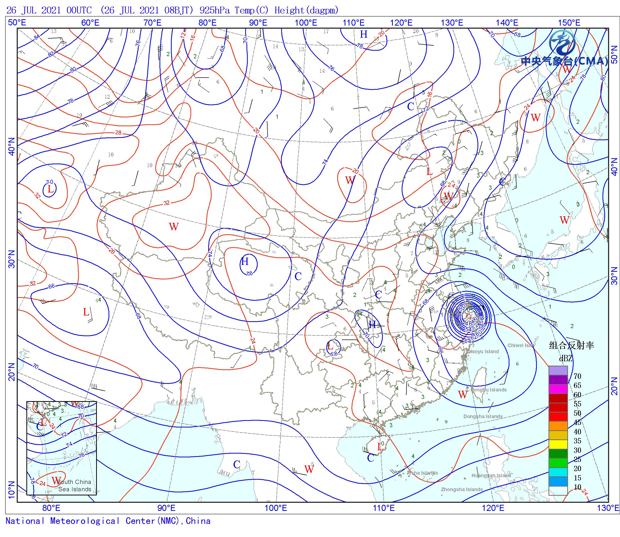 站点的填图要素包括:风向风速和温度露点差;天气系统符号包括:高压中心(H)、低压中心(L)、暖中心(W)、冷中心(C)和台风符号;蓝色等值线为等高线(单位dagpm);红色等值线为等温线(单位℃),其中零摄氏度以下以虚线显示。底层填色为地形高度;顶层填色为雷达组合反射率因子拼图。