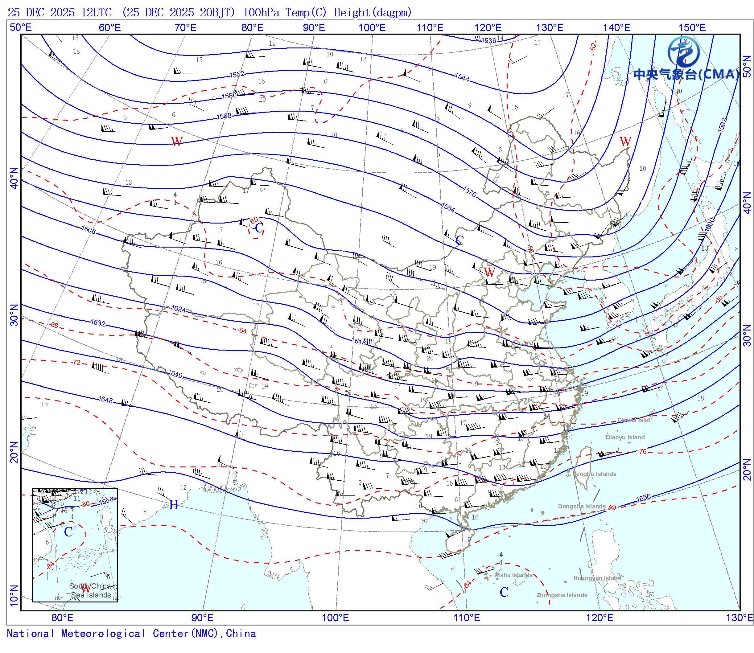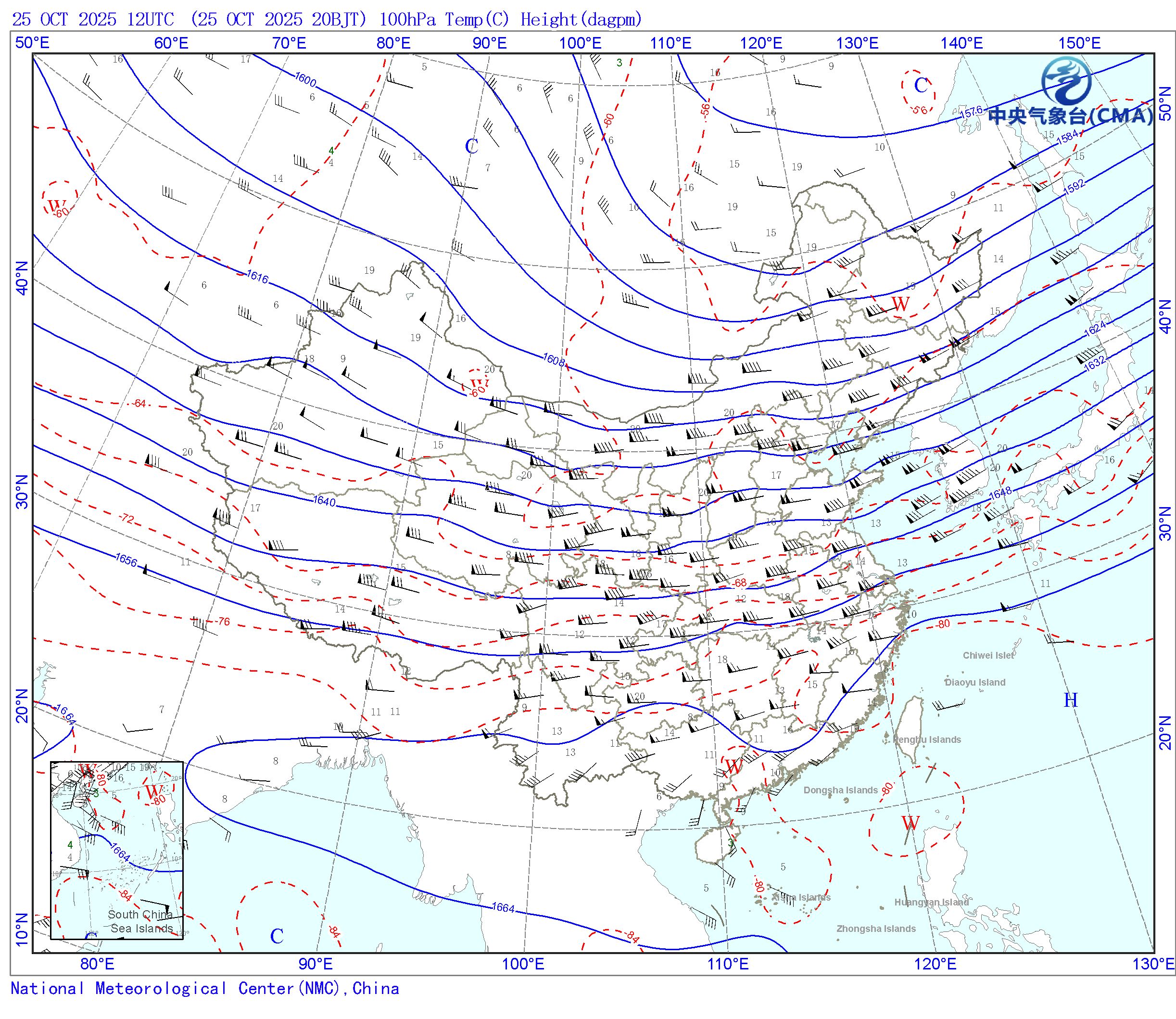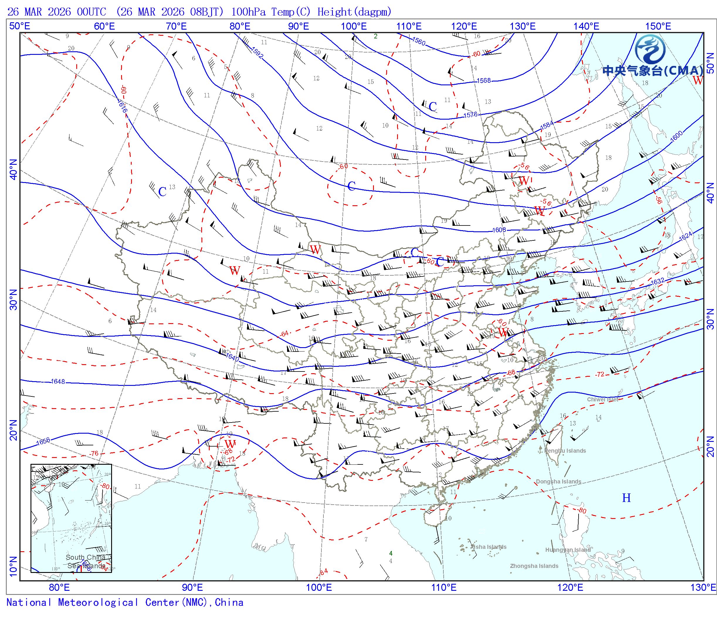 站点的填图要素包括:风向风速和温度露点差;天气系统符号包括:高压中心(H)、低压中心(L)、暖中心(W)、冷中心(C)和台风符号;蓝色等值线为等高线(单位dagpm);红色等值线为等温线(单位℃),其中零摄氏度以下以虚线显示。