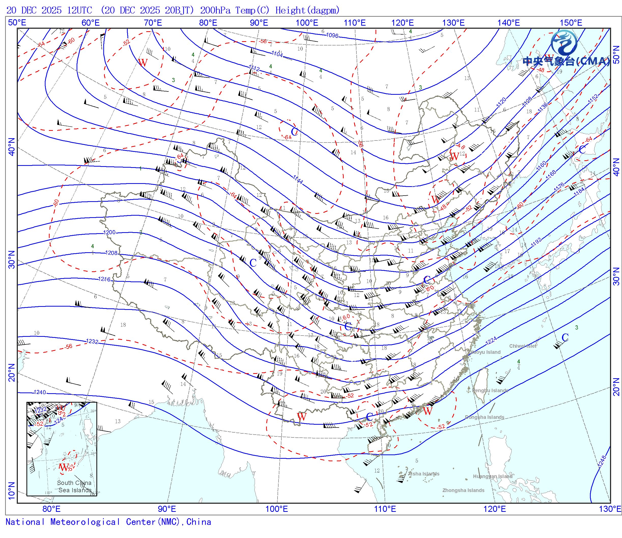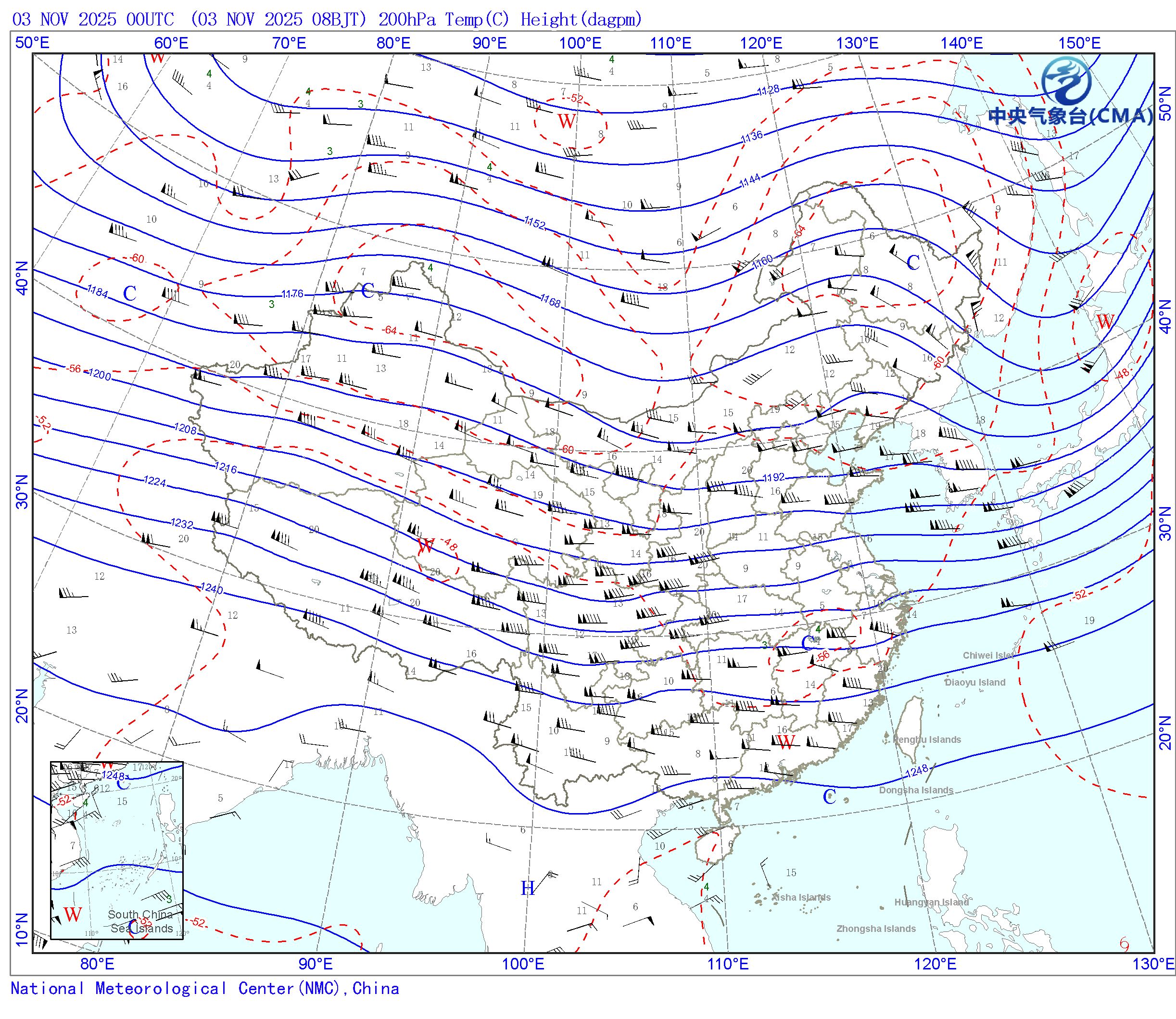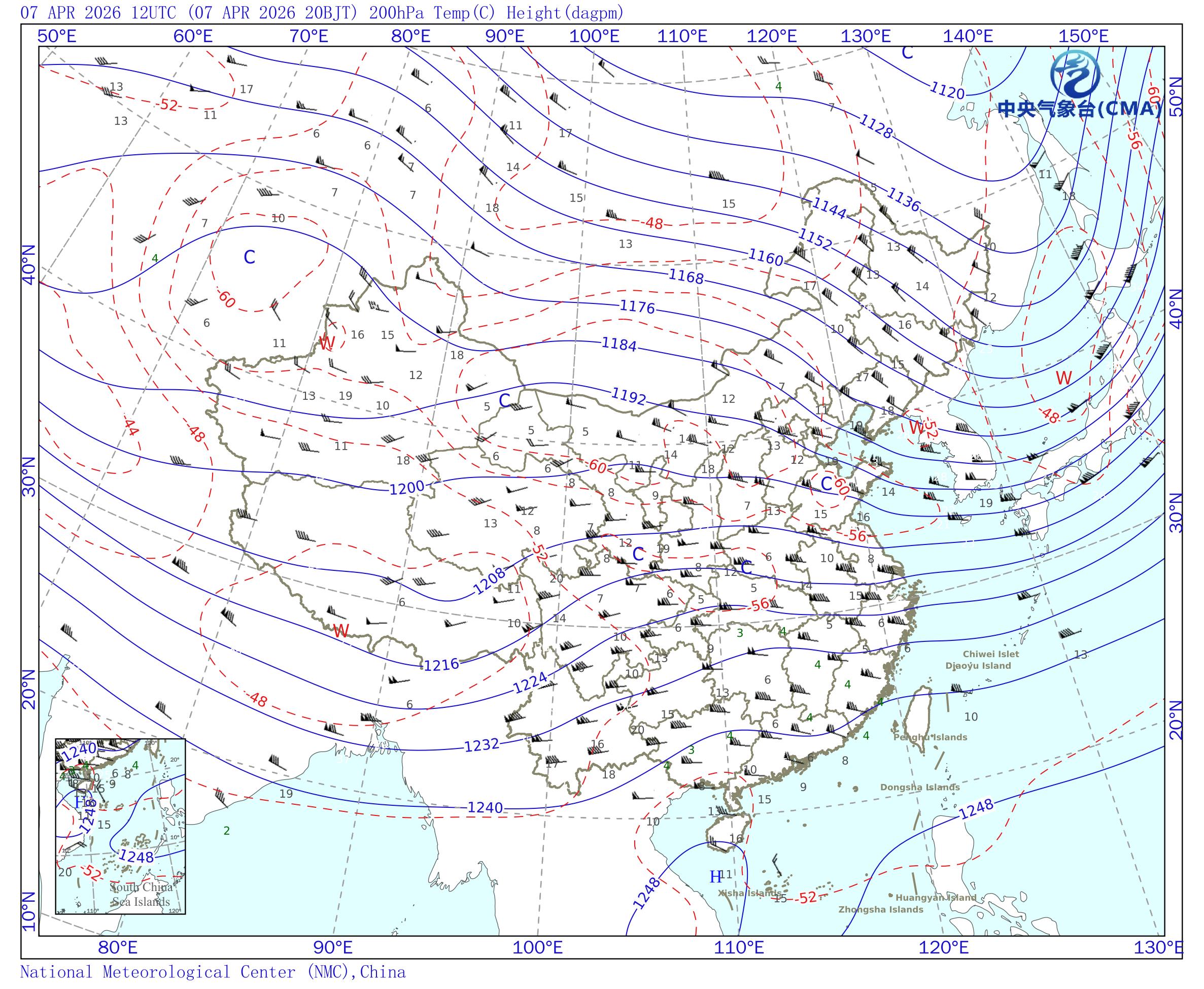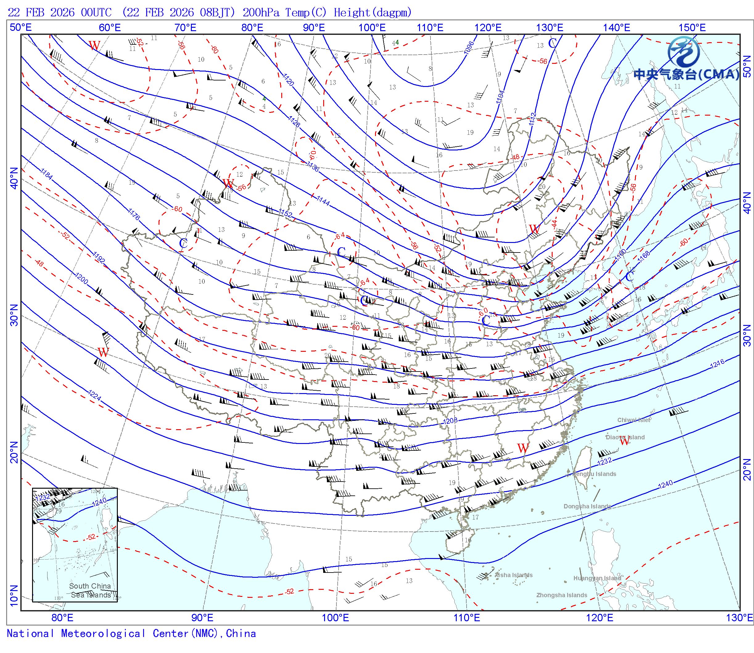 站点的填图要素包括:风向风速和温度露点差;天气系统符号包括:高压中心(H)、低压中心(L)、暖中心(W)、冷中心(C)和台风符号;蓝色等值线为等高线(单位dagpm);红色等值线为等温线(单位℃),其中零摄氏度以下以虚线显示。
