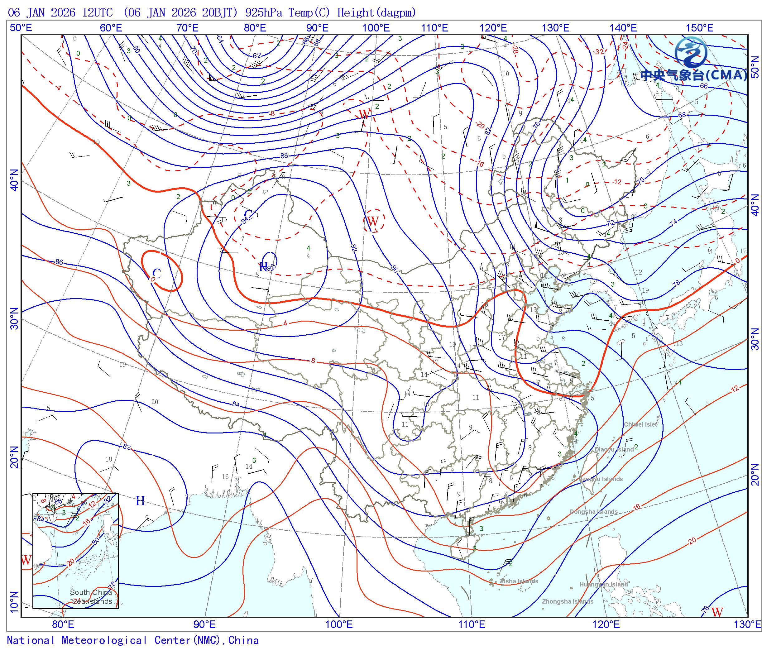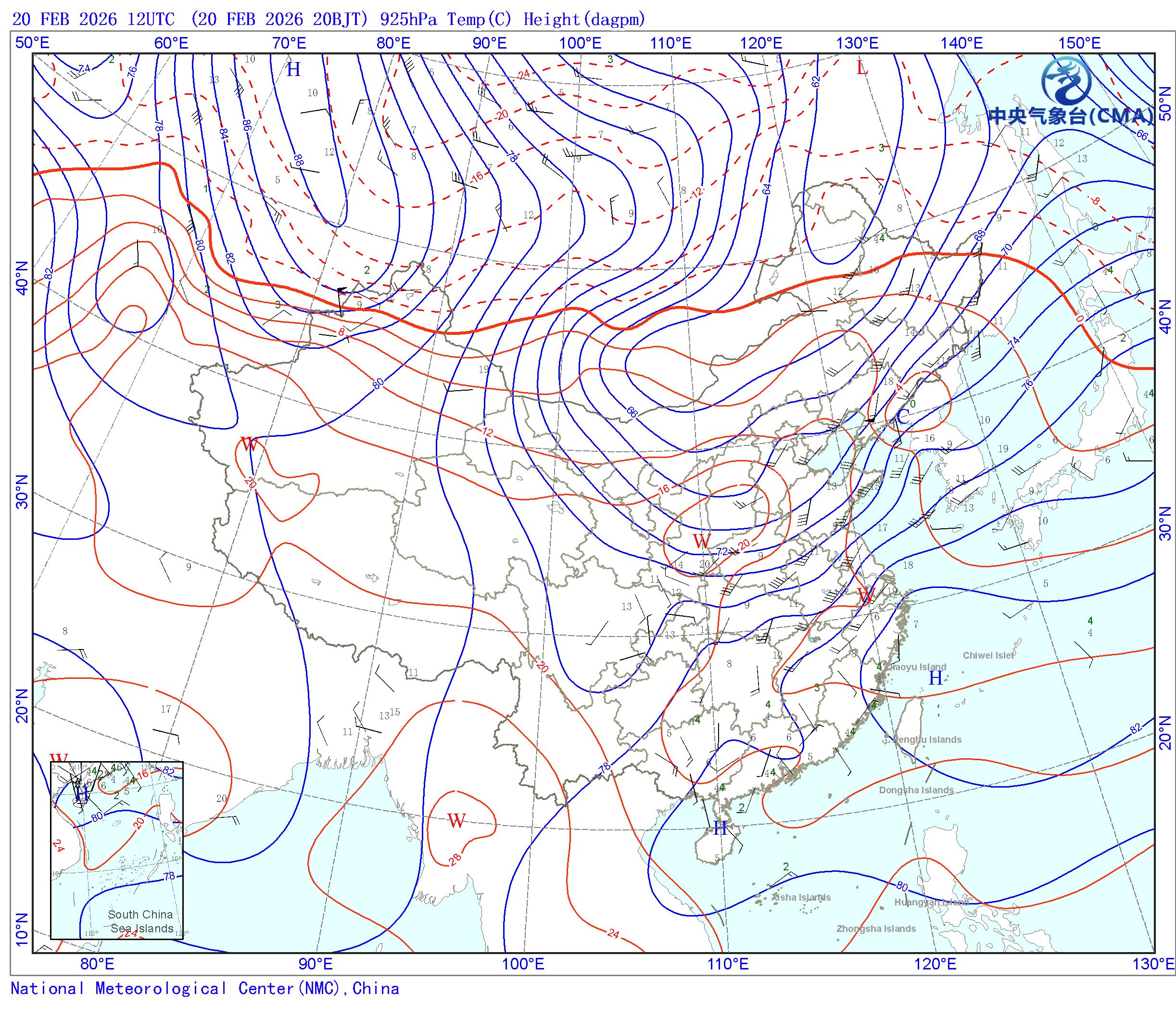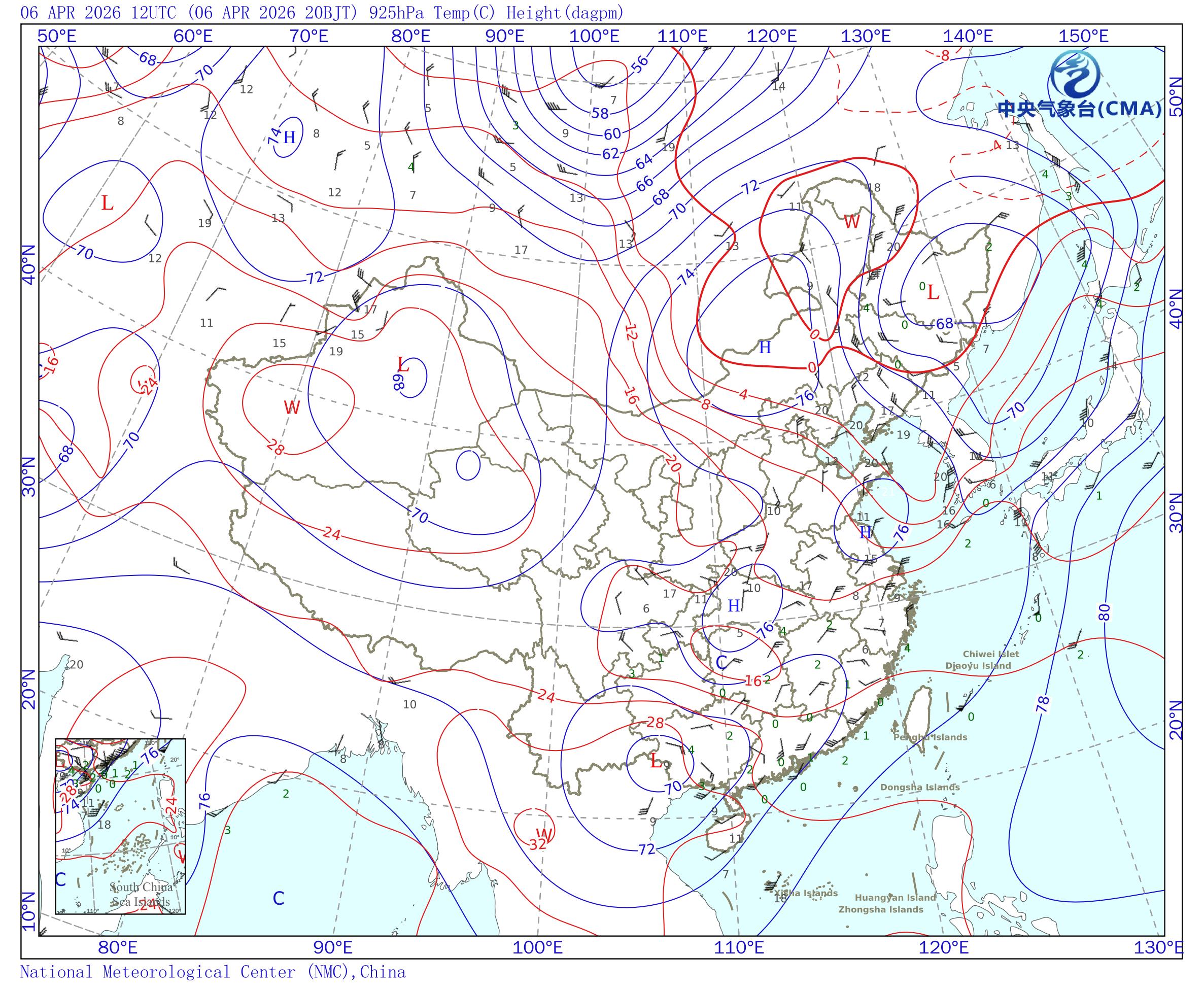 站点的填图要素包括:风向风速和温度露点差;天气系统符号包括:高压中心(H)、低压中心(L)、暖中心(W)、冷中心(C)和台风符号;蓝色等值线为等高线(单位dagpm);红色等值线为等温线(单位℃),其中零摄氏度以下以虚线显示。