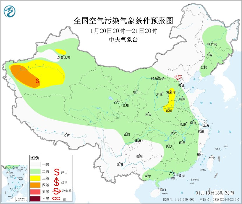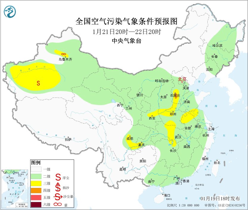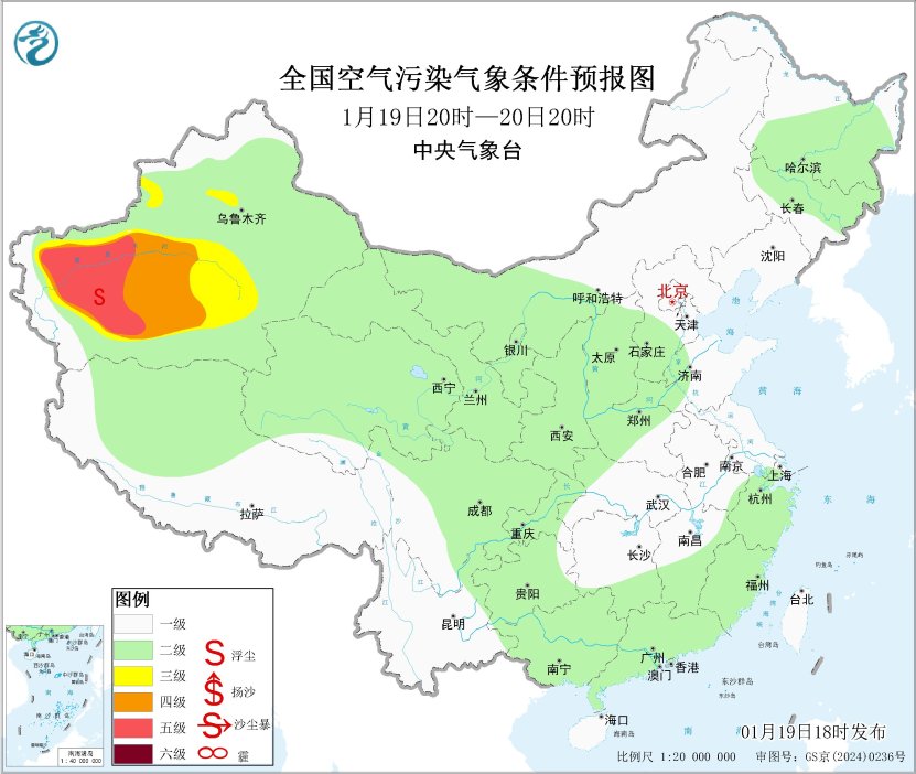 19日夜间至20日,新疆南部等地有扬沙或浮尘。21日起,新疆天山北坡大气扩散条件一般,有轻至中度霾。