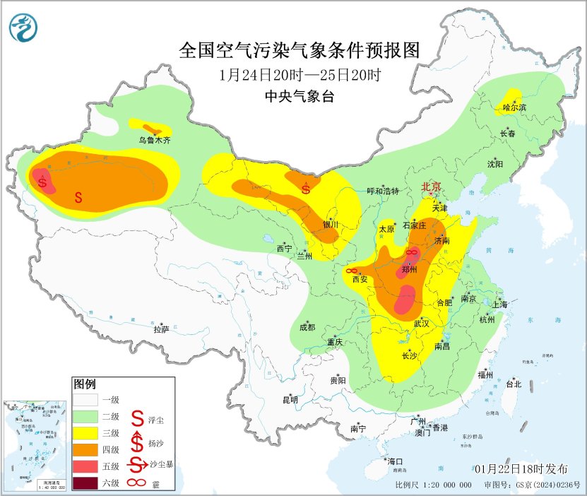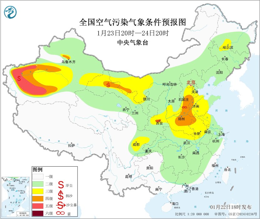 22日夜间起,区域大部大气扩散条件逐步转差,山西中南部、陕西关中等地的部分地区有将有轻至中度霾。