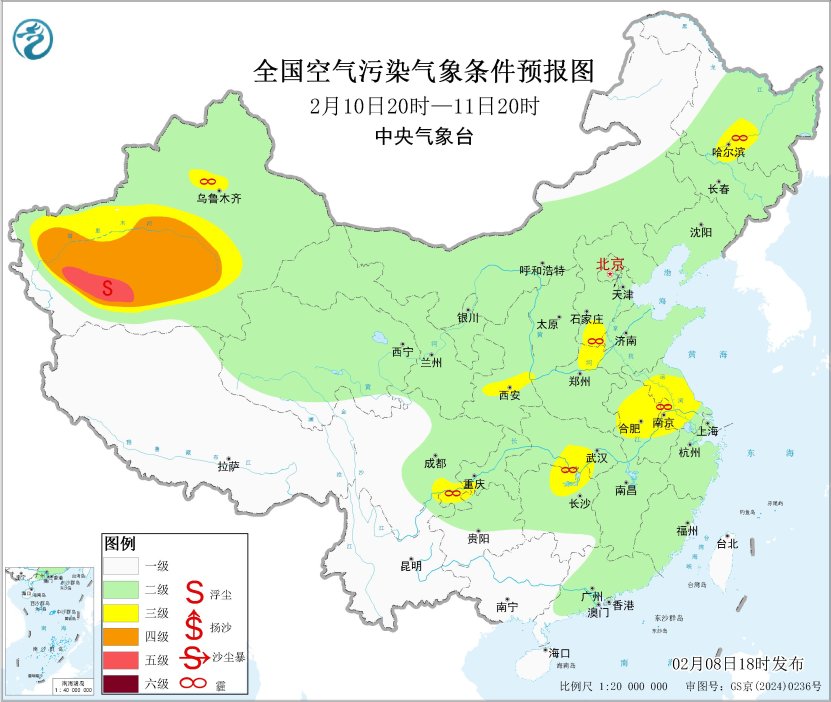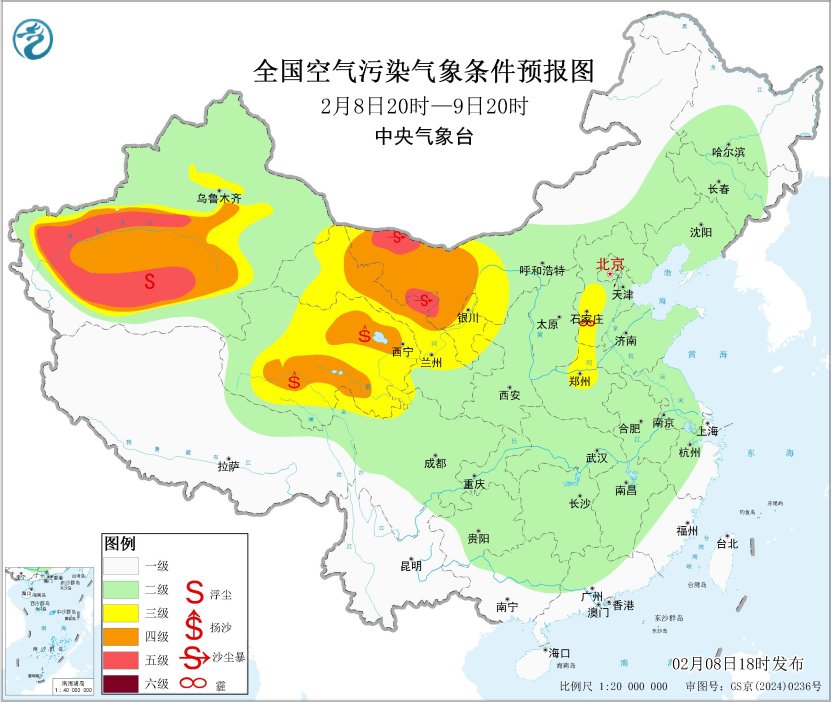 受冷空气大风影响,2月8日20时至9日20时,新疆南疆盆地、内蒙古西部、甘肃中西部、青海中东部等地的部分地区有扬沙或浮尘天气,局地有沙尘暴或强沙尘暴。中央气象台2月8日18时发布沙尘暴蓝色预警。