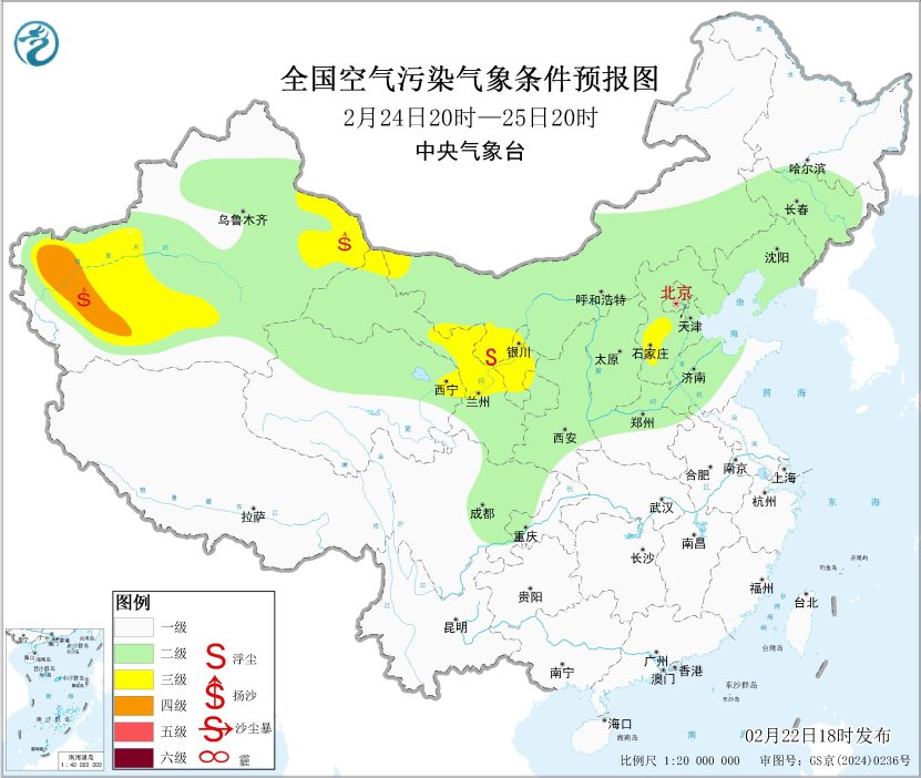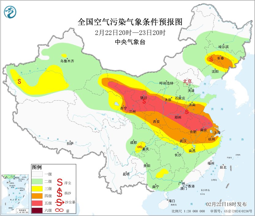 受冷空气大风影响,预计2月22日20时至23日20时,新疆南疆盆地、甘肃中东部、宁夏、陕西中北部、山西南部、河北南部、山东南部、河南、湖北中北部、江西北部、安徽、江苏、上海、浙江中北部、吉林南部、辽宁北部等地的部分地区有扬沙或浮尘天气。中央气象台于2月22日18时继续发布沙尘暴蓝色预警。