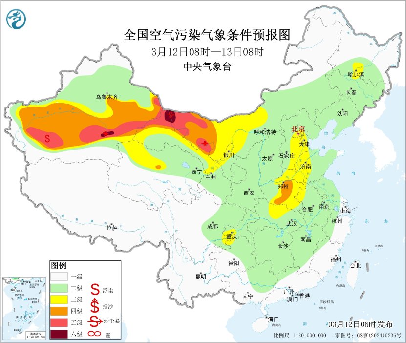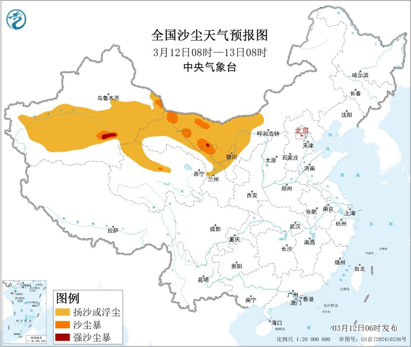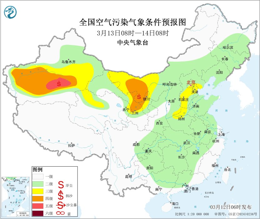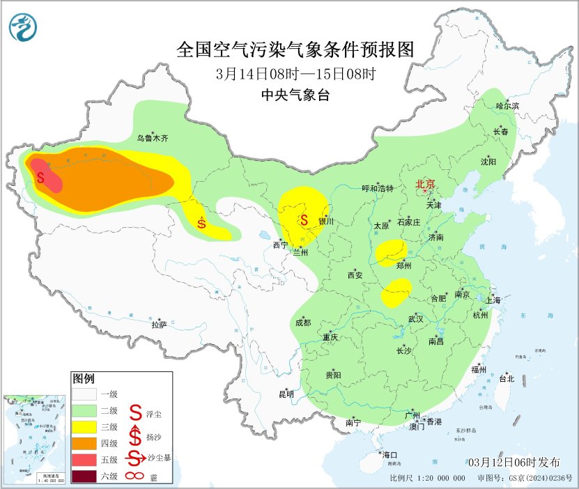 未来一周,全国大部地区大气扩散和湿清除条件较好,无持续性霾天气。受大风天气影响,12日至13日,我国西北地区有沙尘天气。中央气象台于3月12日06时继续发布沙尘暴蓝色预警。预计3月12日08时至13日08时,新疆东部和南部、内蒙古西部、甘肃西部、青海北部、宁夏中北部等地的部分地区有扬沙或浮尘天气,其中,新疆南疆盆地东部、内蒙古西部、甘肃西部局地有沙尘暴或强沙尘暴。