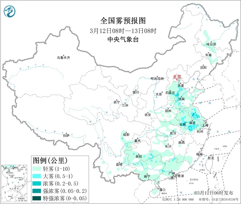 此外,12日早晨至上午,河北东部、山东西部、江苏中部、安徽中部和东南部等地的部分地区有大雾,局地能见度低于200米。
