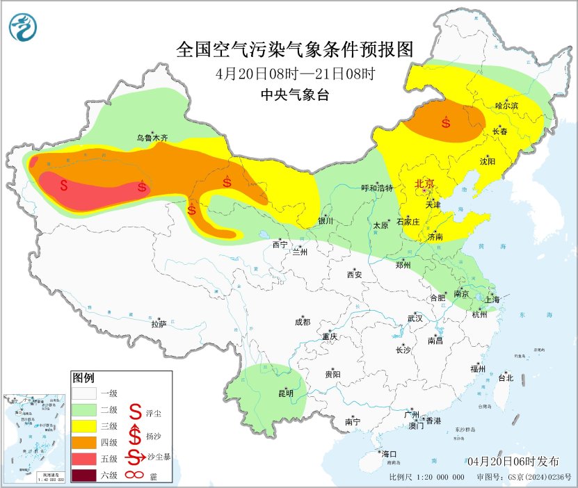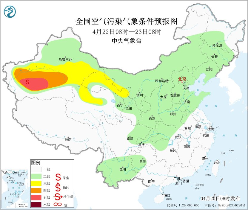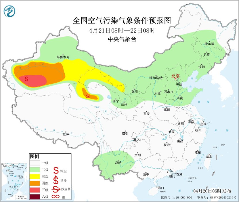 受冷空气大风影响,预计4月20日08时至21日08时,新疆东部和南部、甘肃西部、青海西北部、内蒙古中东部、黑龙江西南部、吉林中西部、辽宁中西部、四川盆地南部等地的部分地区有扬沙或浮尘天气,其中,内蒙古东南部、新疆南部局部有沙尘暴。中央气象台于20日06时继续发布沙尘暴蓝色预警。