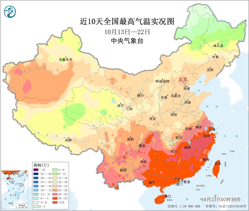 近10天全国最高气温实况图