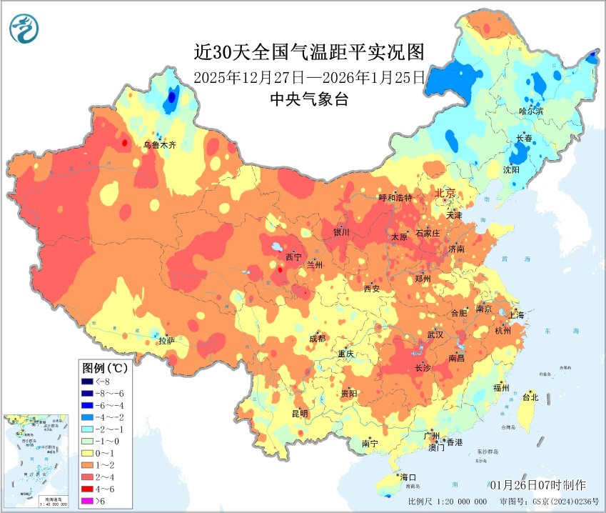 近30天全国平均气温距平图