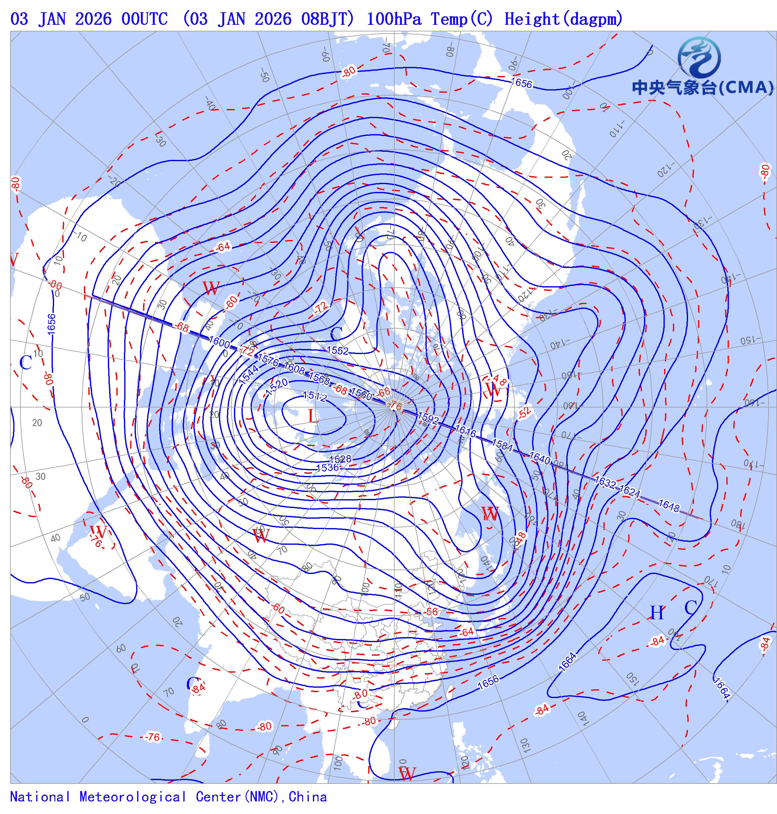天气系统符号包括:高压中心(H)、低压中心(L)、暖中心(W)、冷中心(C)和台风符号;蓝色等值线为等高线(单位dagpm);红色等值线为等温线(单位℃),其中零摄氏度以下以虚线显示。