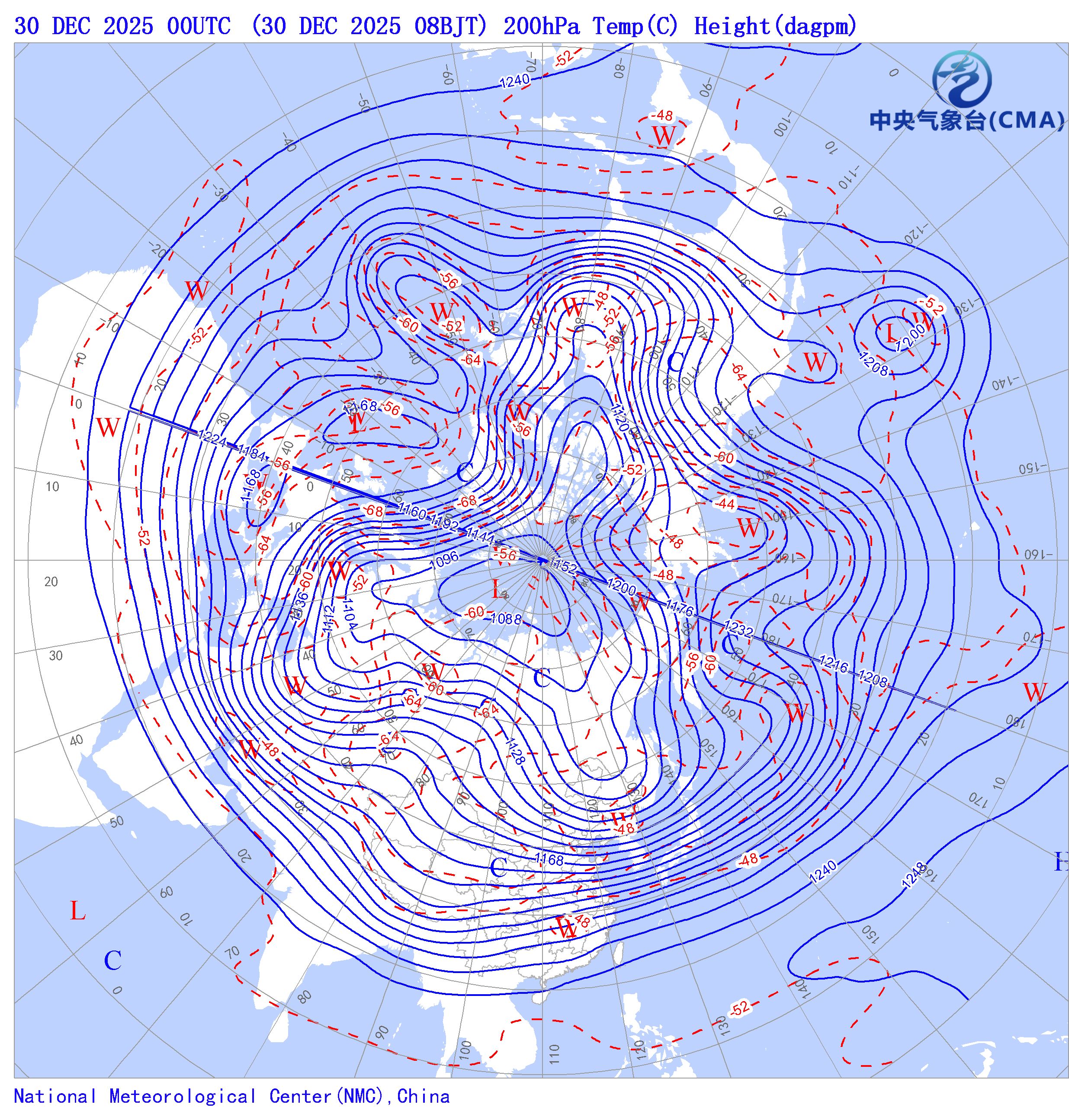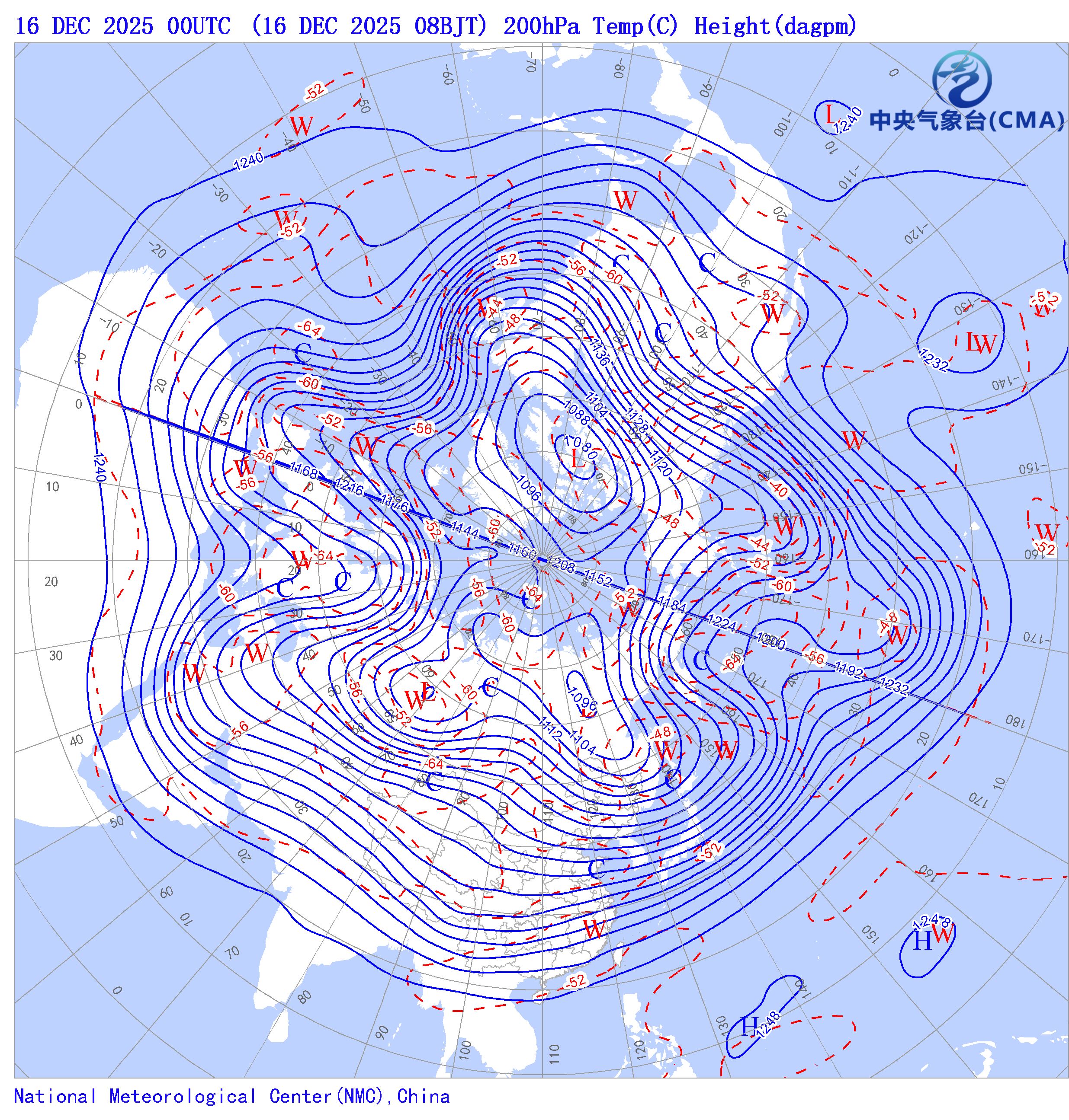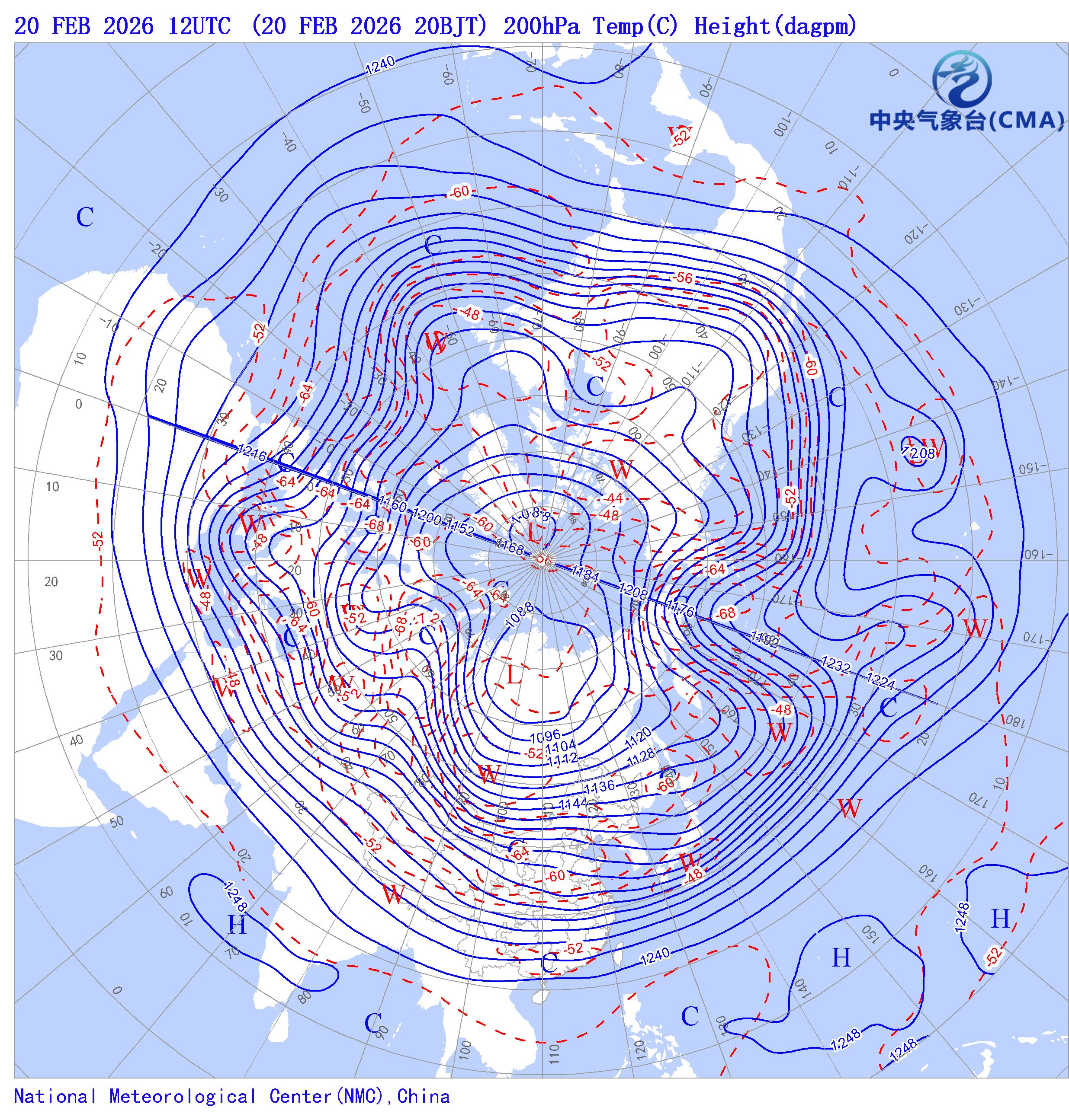 天气系统符号包括:高压中心(H)、低压中心(L)、暖中心(W)、冷中心(C)和台风符号;蓝色等值线为等高线(单位dagpm);红色等值线为等温线(单位℃),其中零摄氏度以下以虚线显示。