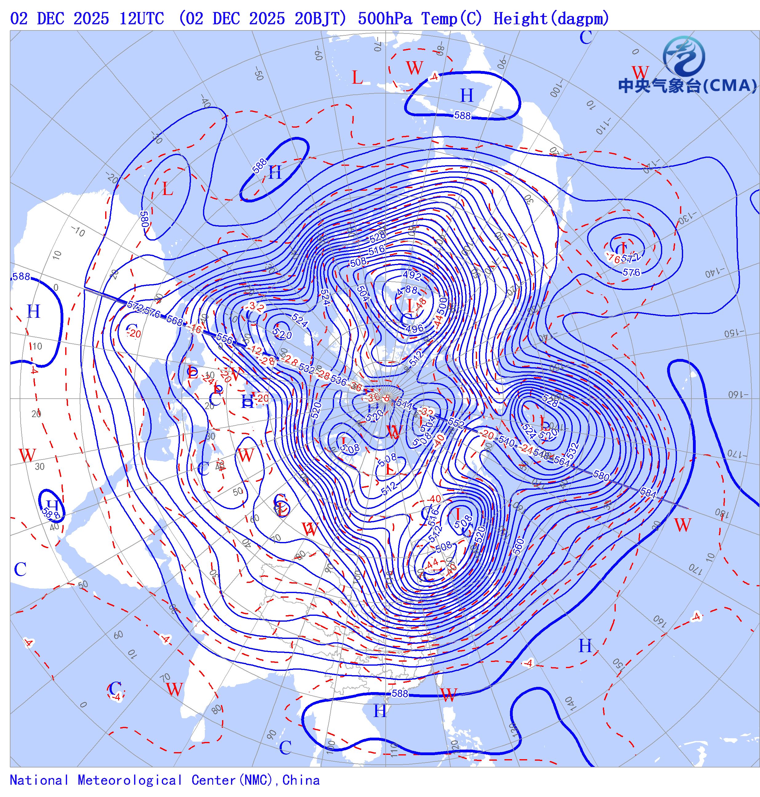 天气系统符号包括:高压中心(H)、低压中心(L)、暖中心(W)、冷中心(C)和台风符号;蓝色等值线为等高线(单位dagpm);红色等值线为等温线(单位℃),其中零摄氏度以下以虚线显示。