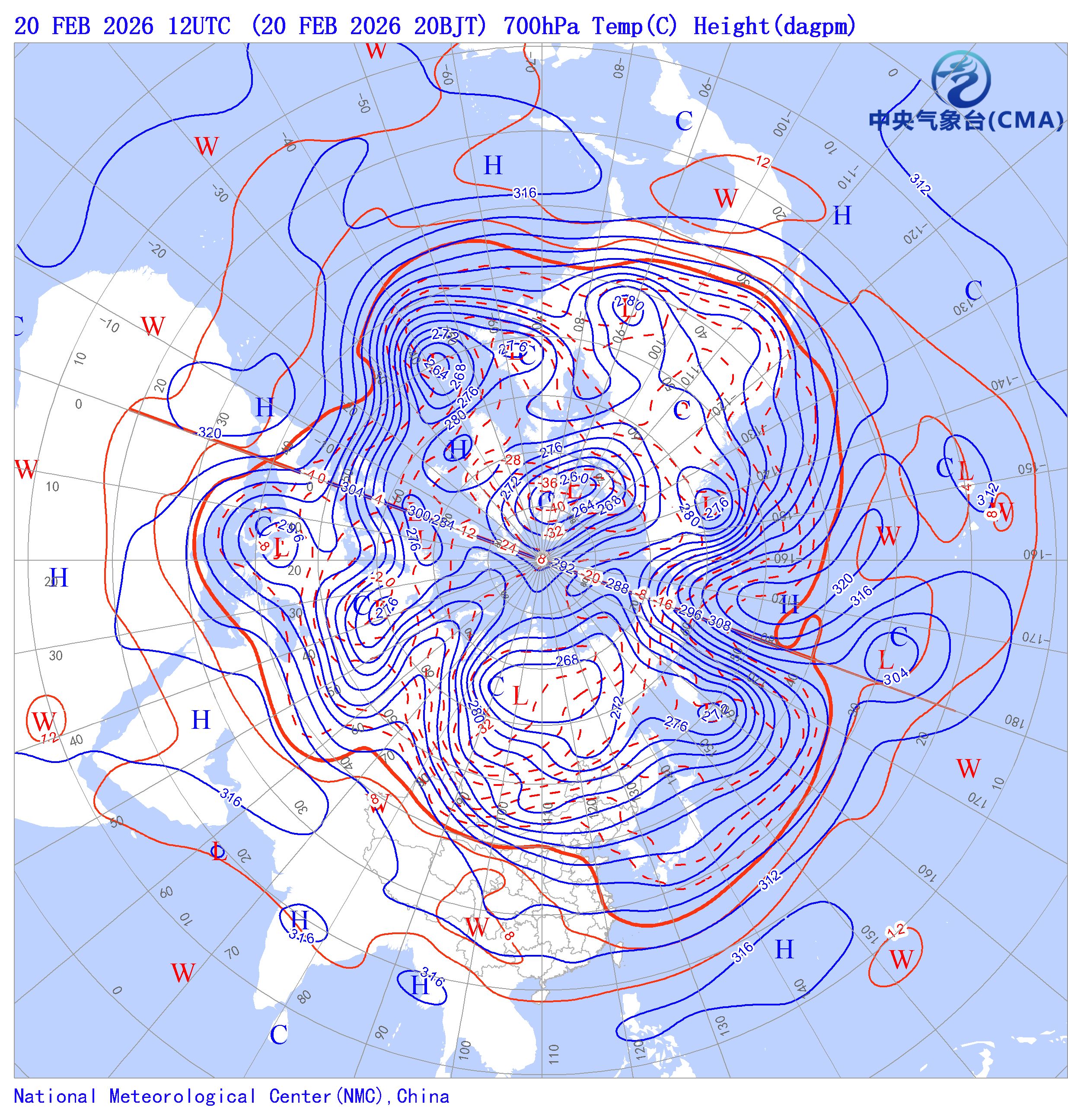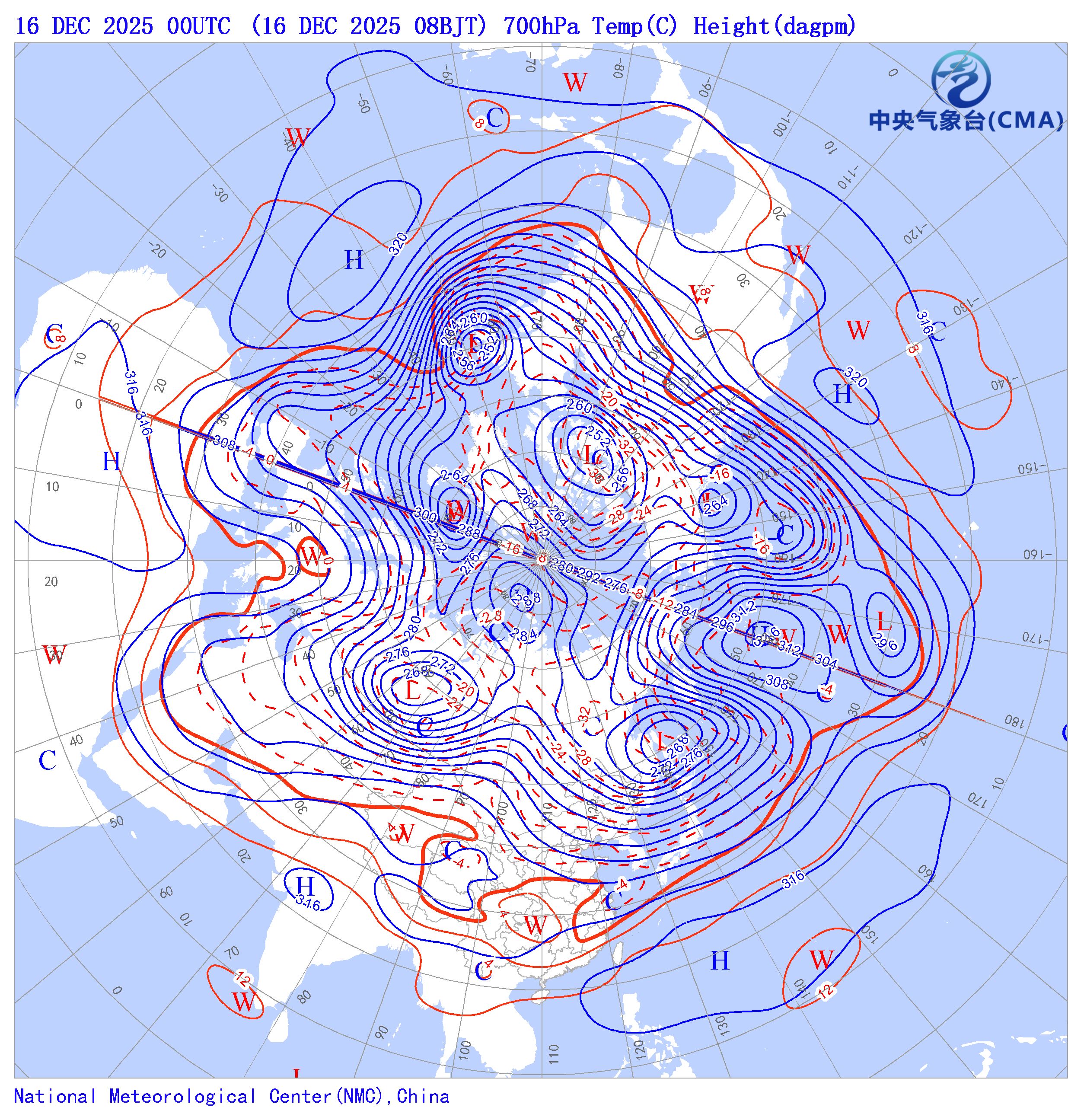 天气系统符号包括:高压中心(H)、低压中心(L)、暖中心(W)、冷中心(C)和台风符号;蓝色等值线为等高线(单位dagpm);红色等值线为等温线(单位℃),其中零摄氏度以下以虚线显示。