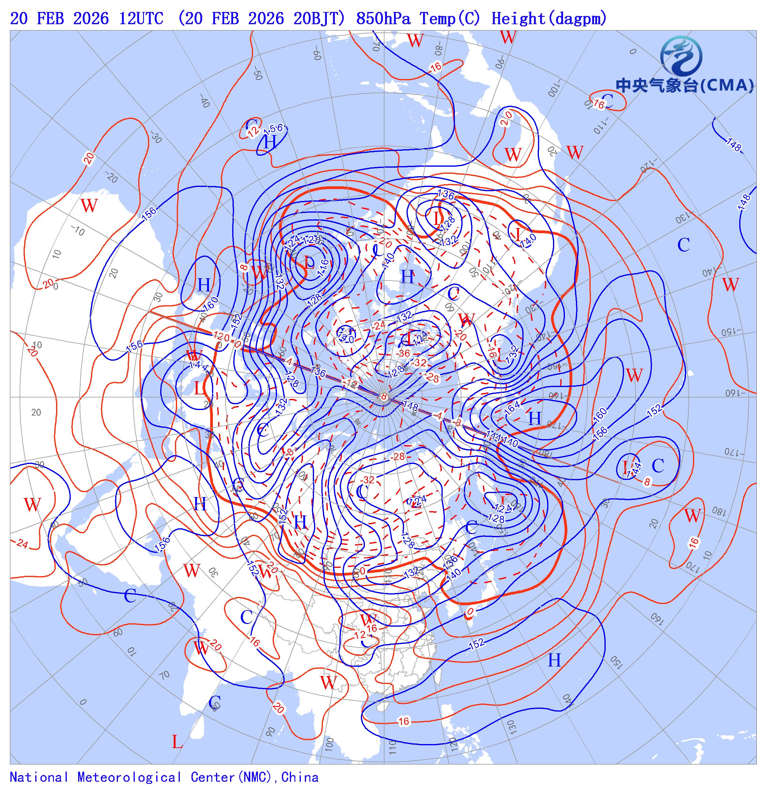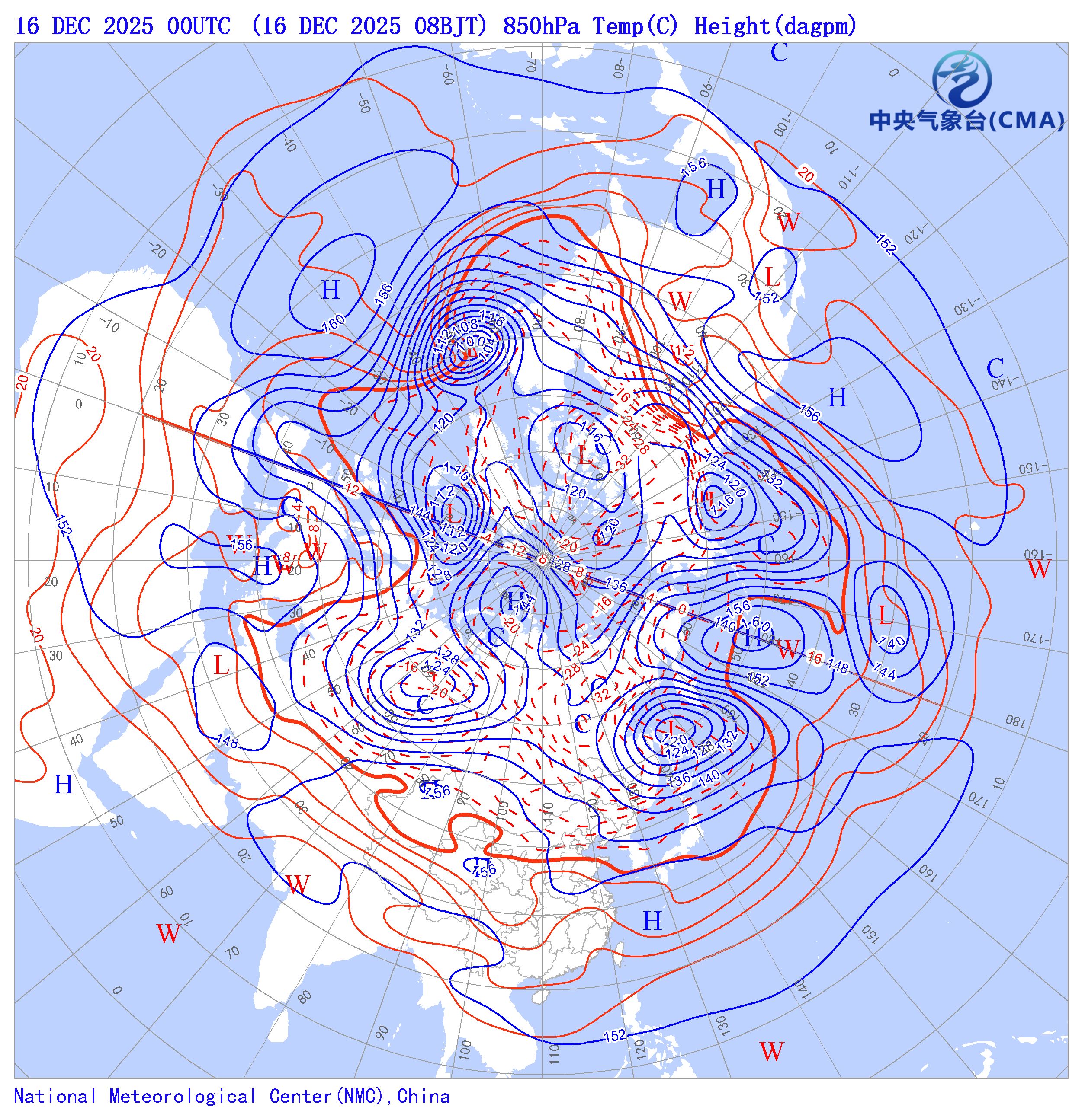 天气系统符号包括:高压中心(H)、低压中心(L)、暖中心(W)、冷中心(C)和台风符号;蓝色等值线为等高线(单位dagpm);红色等值线为等温线(单位℃),其中零摄氏度以下以虚线显示。