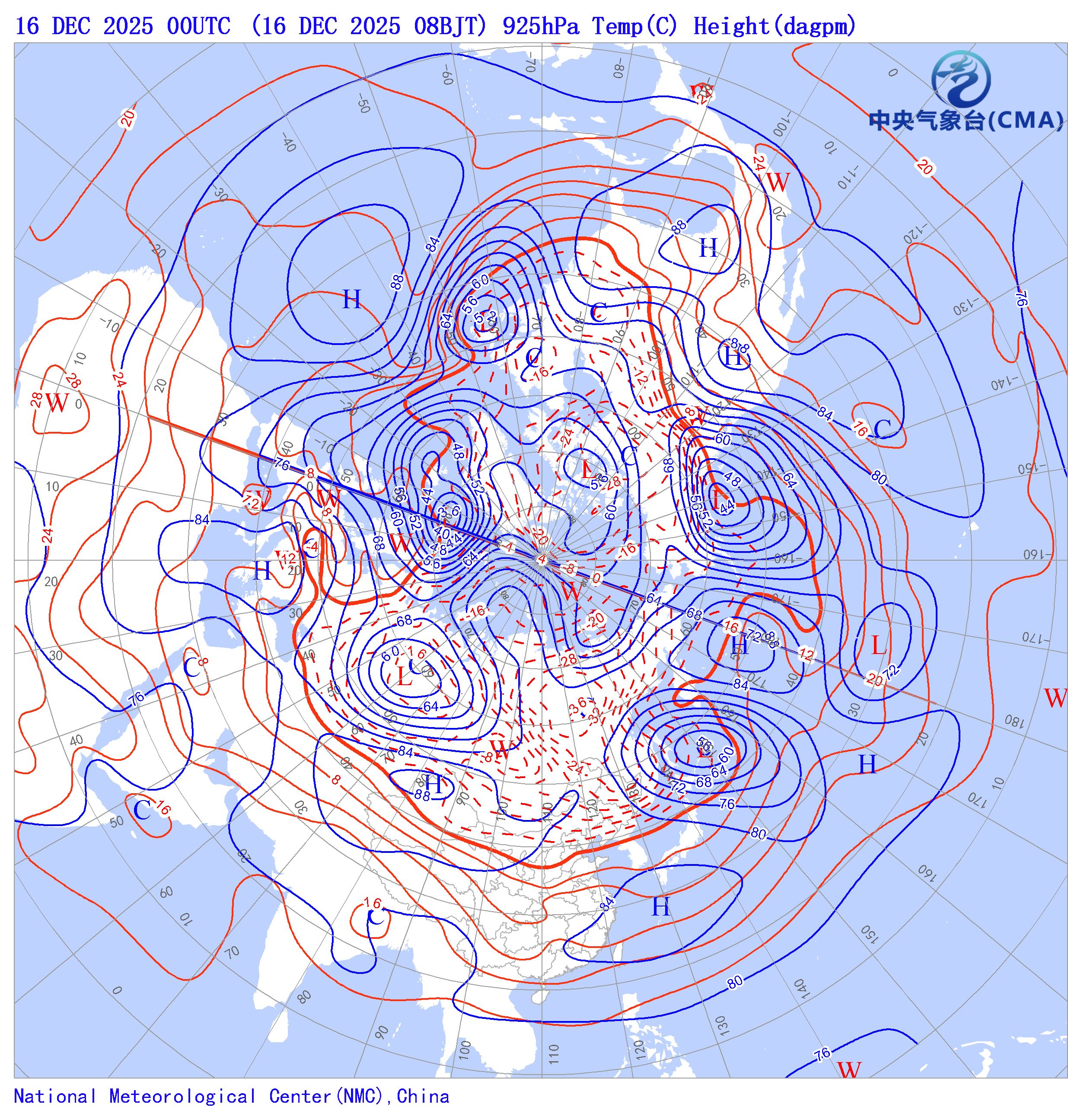 天气系统符号包括:高压中心(H)、低压中心(L)、暖中心(W)、冷中心(C)和台风符号;蓝色等值线为等高线(单位dagpm);红色等值线为等温线(单位℃),其中零摄氏度以下以虚线显示。