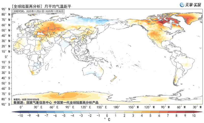 11月处于季节转换时期,月内北半球冷空气活动比较频繁,但是强度总体不强。上旬,西伯利亚和中亚气温偏低1~3℃,而欧洲大部、亚洲和北美大部气温明显偏高,多地最高气温突破历史记录。中旬,极涡偏向东半球,北欧频繁受到冷空气影响,气温转为偏低,中亚、东欧和西西伯利亚转为偏高,北美偏高幅度增大,美国和墨西哥多地最高气温突破历史记录。下旬,欧洲冷涡东移,欧洲西海岸多低压槽,西欧、南欧受冷暖气流交替影响,气温波动大。南半球处于春末向初夏过渡的时段,南极大陆气温偏高幅度逐步增大,向北的冷空气势力较弱,中下旬,非洲南部、澳大利亚东部、阿根廷和智利南部气温偏高。此外,赤道西太平洋海温仍高于28℃,马来群岛、印尼、巴布亚新几内亚等东南亚和大洋洲岛国白天气温超过34℃。