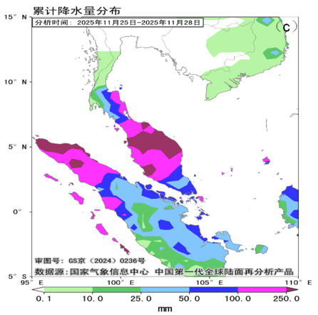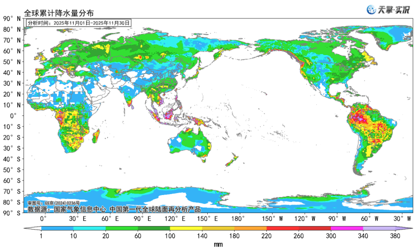 图2 2025年11月全球累计降水量分布(单位:mm)