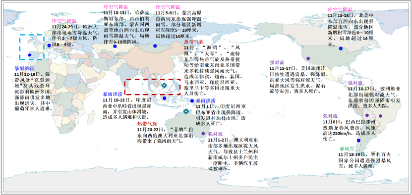 11月,全球范围内灾害性天气主要表现为赤道暴雨洪涝、欧洲和西伯利亚多强雨雪、北印度洋和西太平洋热带气旋活跃等特征(图3)。北半球中高纬度地区则频繁遭受冷空气侵袭,欧洲大部、哈萨克斯坦、蒙古国、西西伯利亚、北美中东部等地区出现强降温、雨雪和大风天气,给当地电力设施运维、交通运输等行业带来严重影响。18-19日,智利百内国家公园遭遇强暴风雪袭击,造成多人遇难。月内,北印度洋和西北太平洋热带低值系统仍然活跃,“海鸥”“凤凰”“天琴”“迪特瓦”等台风活动,给南亚、东南亚多国带来持续性强降雨和大风天气,菲律宾、越南、泰国、马来西亚、印度尼西亚、斯里兰卡等国因此引发洪涝、山体滑坡等次生灾害,造成重大人员伤亡。中旬,温带气旋“克劳迪娅”及其残余环流先后影响葡萄牙、西班牙、英国、爱尔兰等欧洲国家,强风暴雨引发多地洪灾,葡萄牙出现人员遇难情况。20-22日,热带气旋“菲纳”自东向西移动,给澳大利亚北部沿海地区带来强风雨天气。此外,澳大利亚东南部、巴西巴拉那州、美国加利福尼亚州、玻利维亚等地遭遇冰雹、短时强降水、龙卷风、雷暴大风等强对流天气,对当地民众的生命安全与生产生活造成严重威胁。