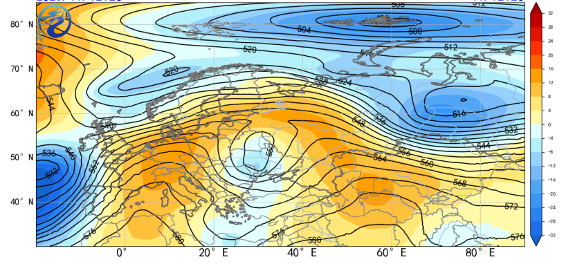 图4 2025年11月12日20:00(BJT)500hPa高度场和距平场