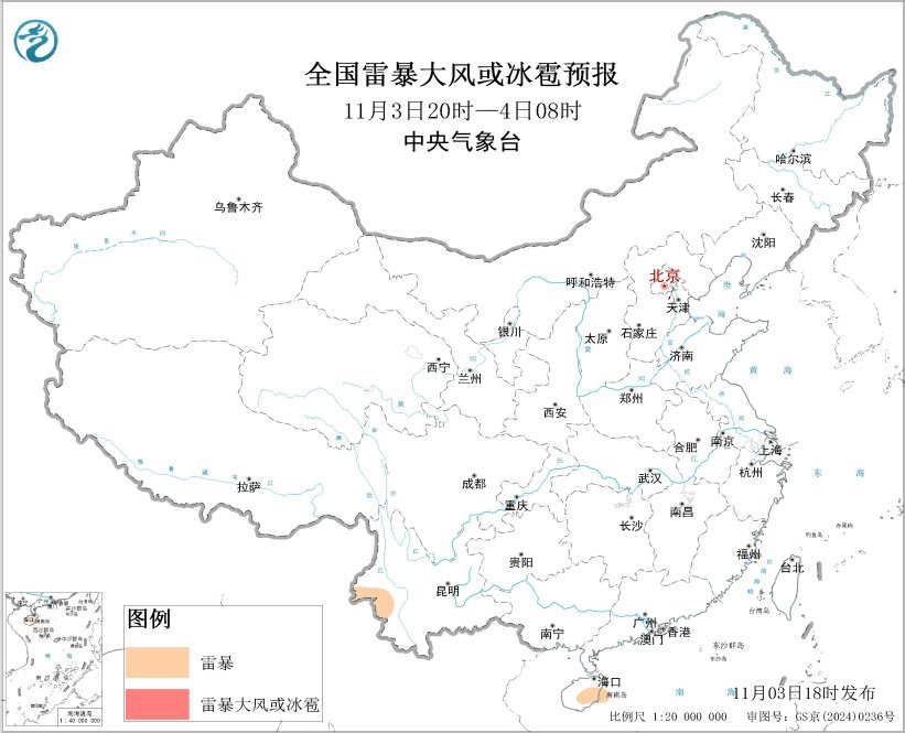 预计11月3日20时至4日20时,云南西南部、海南岛东部等地的部分地区将有短时强降水天气,小时雨量20-30毫米,局地可达40毫米以上;另外,云南西南部、海南岛东部和南部等地的局地将有雷暴。
