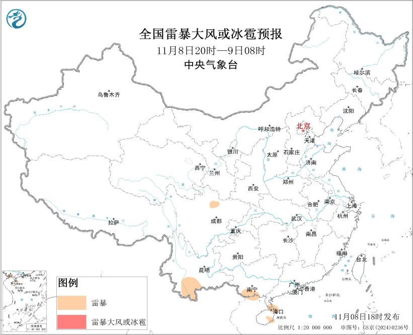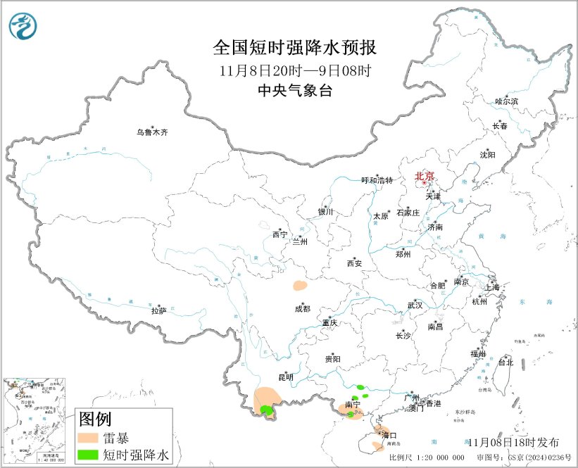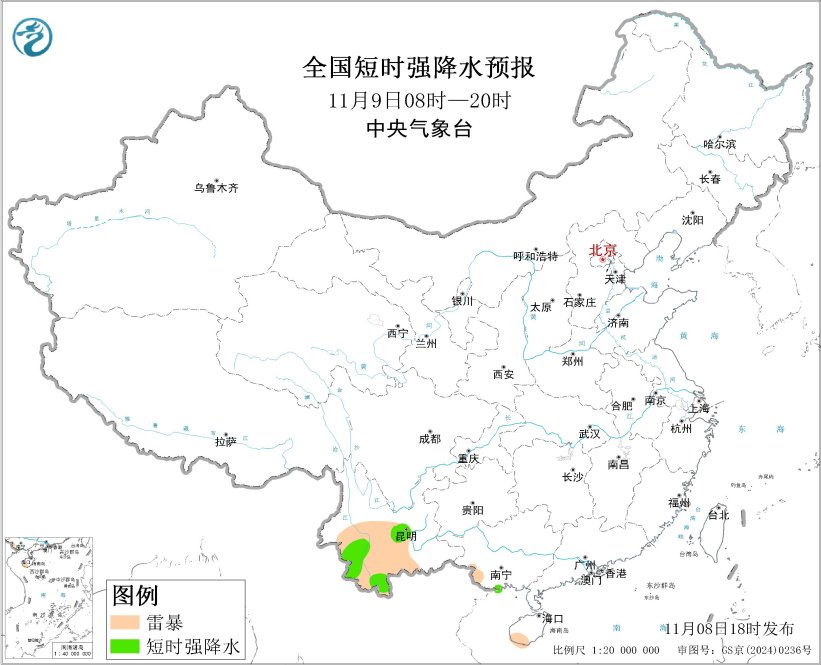 预计11月8日20时至9日20时,云南西南部和中部、广西南部等地的部分地区将有短时强降水天气,小时雨量20-30毫米。