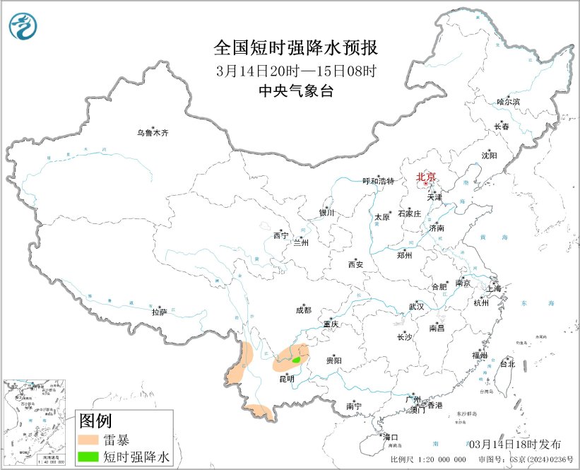 预计3月14日20时至15日20时,云南东北部部分地区将有短时强降水天气,小时雨量20-30毫米,局地可达30毫米以上。