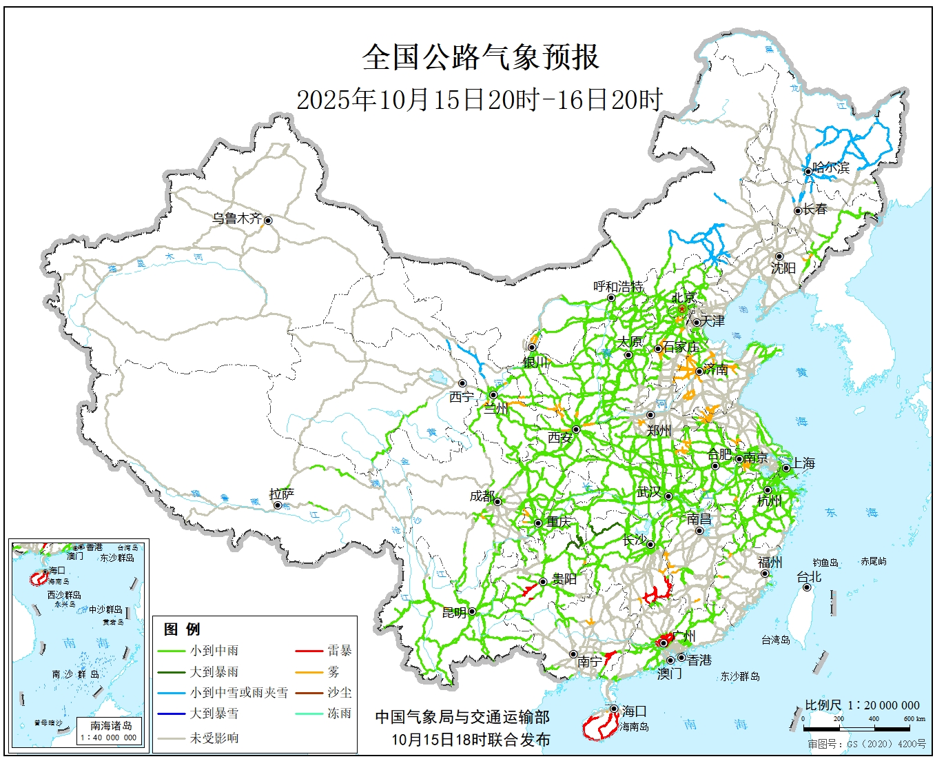 中国气象局与交通运输部2025年10月15日联合发布全国主要公路气象预报