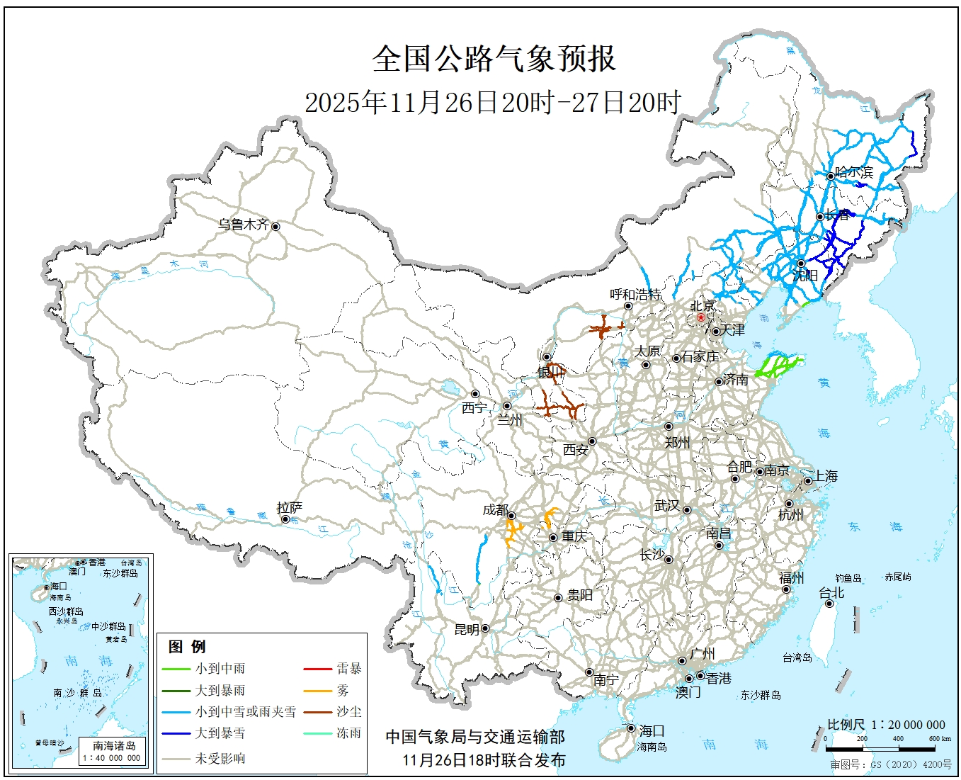 中国气象局与交通运输部2025年11月25日联合发布全国主要公路气象预报