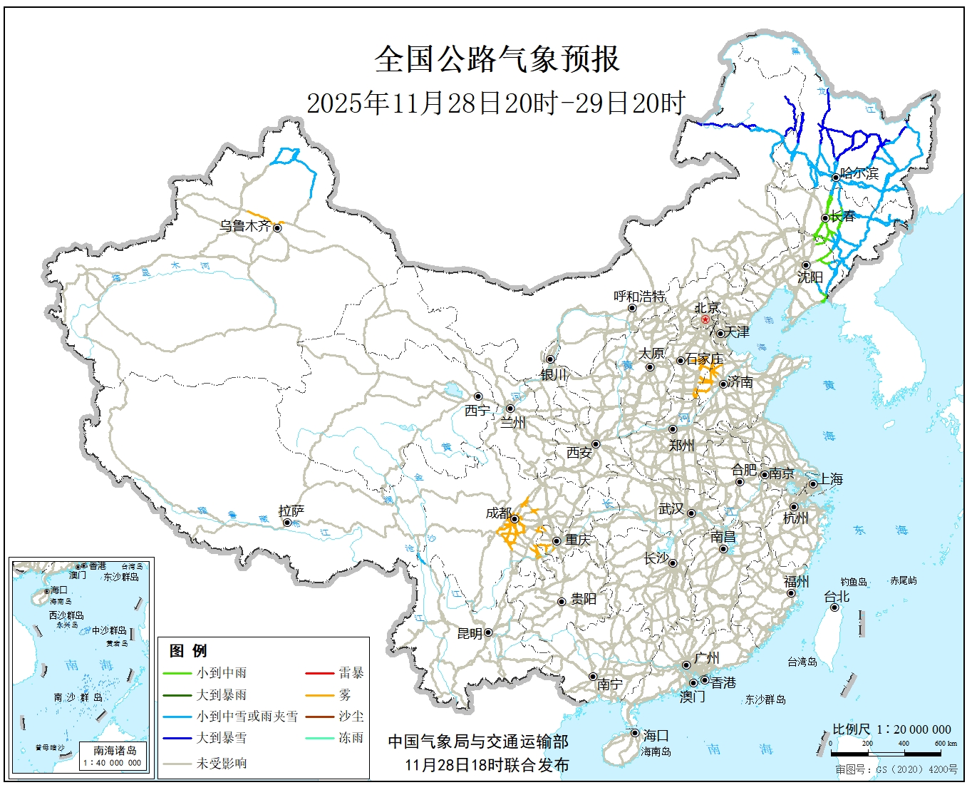 中国气象局与交通运输部2025年11月28日联合发布全国主要公路气象预报