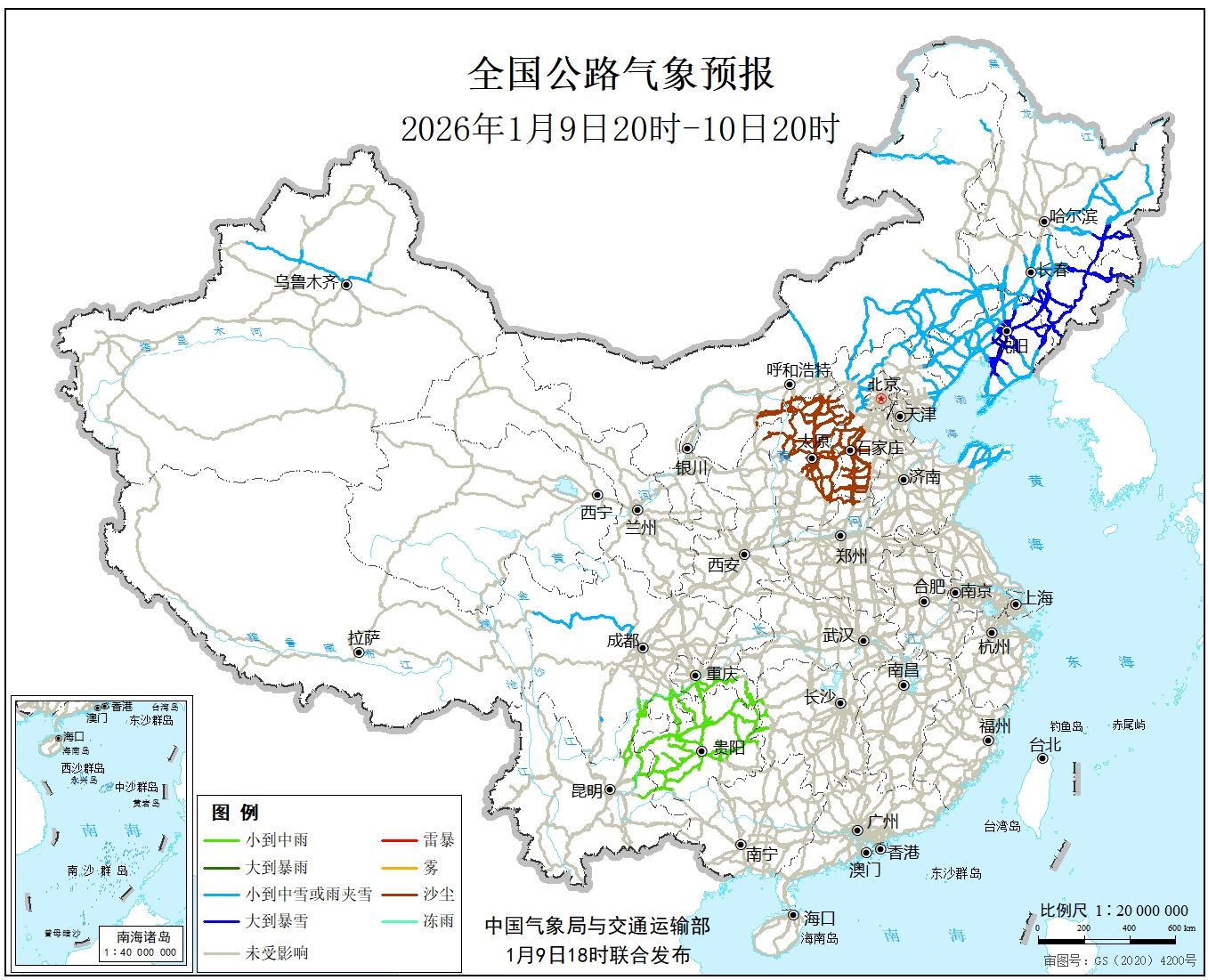 中国气象局与交通运输部2026年01月09日联合发布全国主要公路气象预报