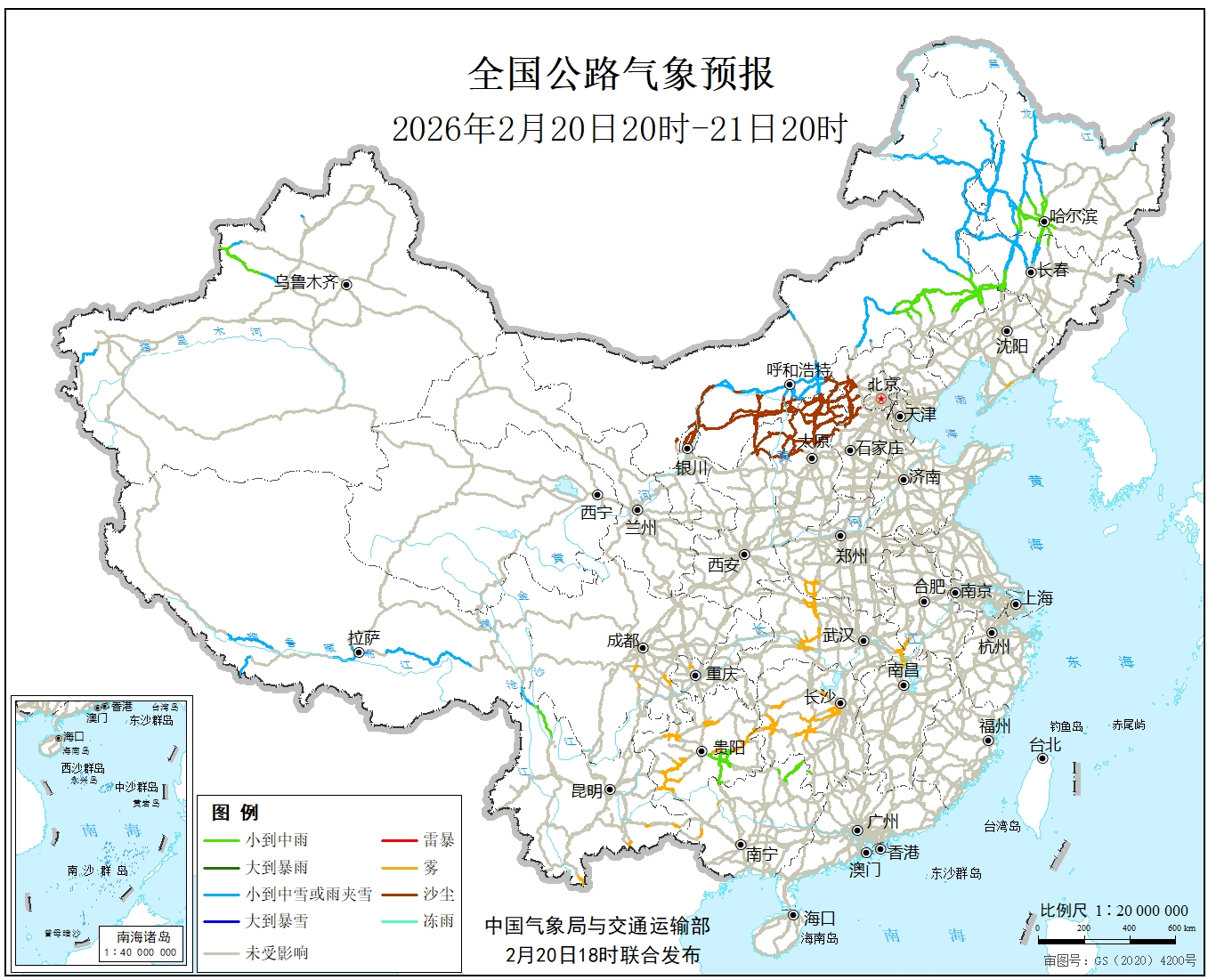 中国气象局与交通运输部2026年02月20日联合发布全国主要公路气象预报