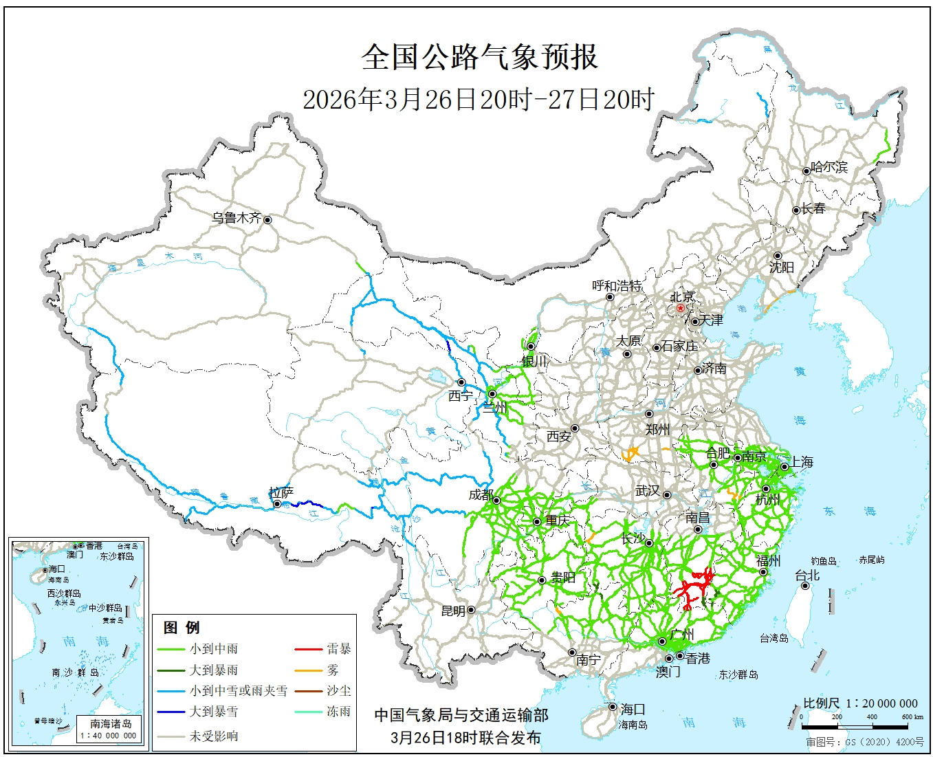 中国气象局与交通运输部2026年03月26日联合发布全国主要公路气象预报