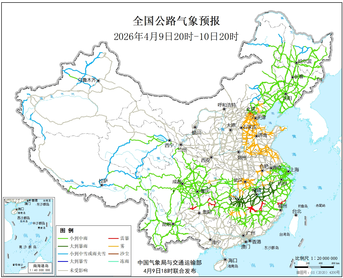 中国气象局与交通运输部2026年04月09日联合发布全国主要公路气象预报