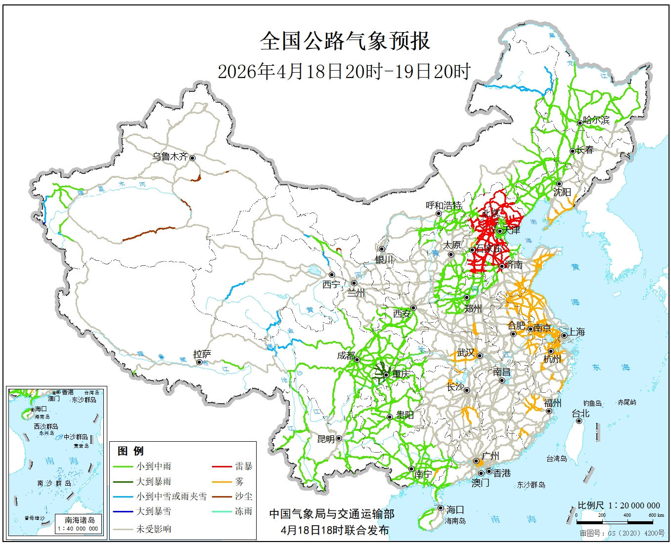 中国气象局与交通运输部2026年04月18日联合发布全国主要公路气象预报