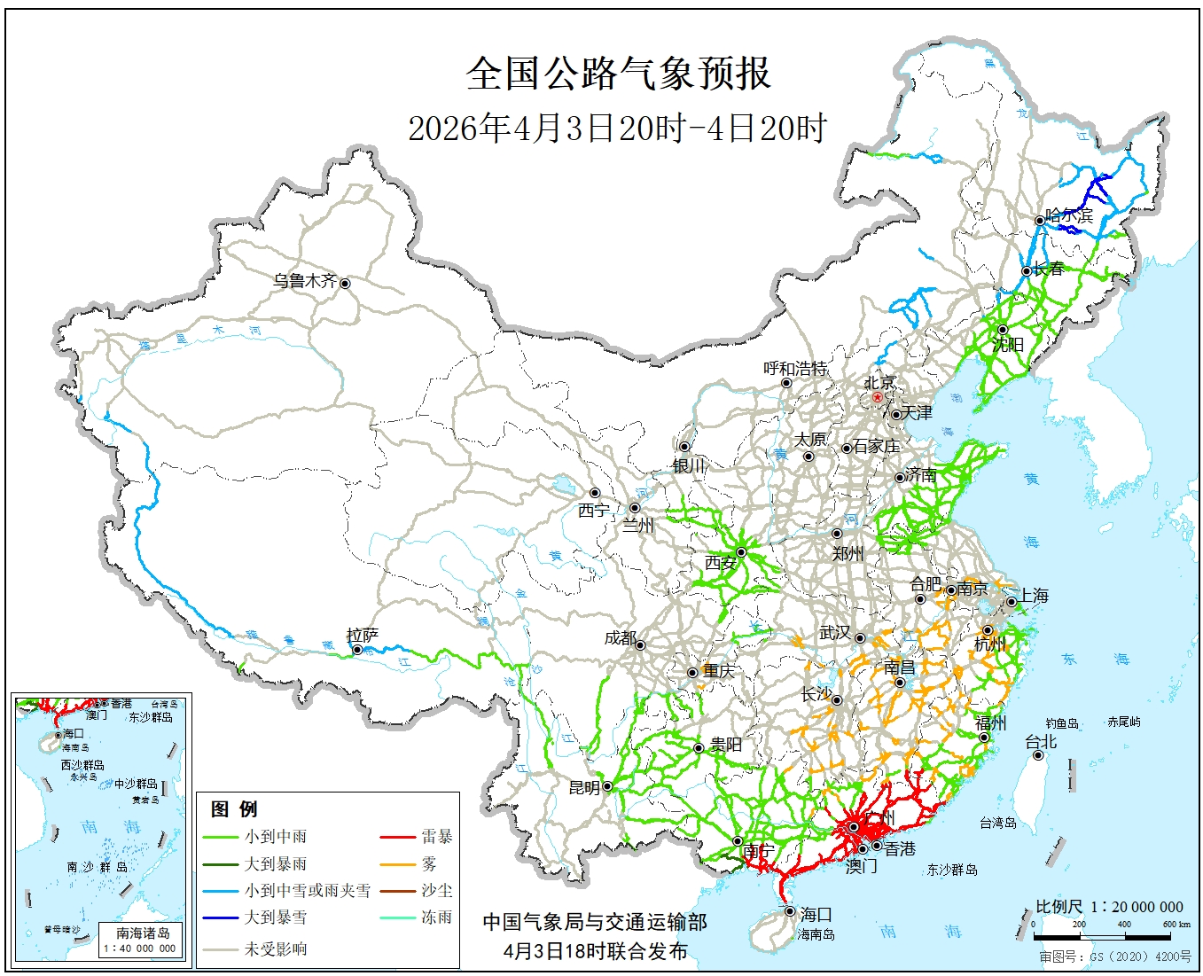中国气象局与交通运输部2026年04月03日联合发布全国主要公路气象预报