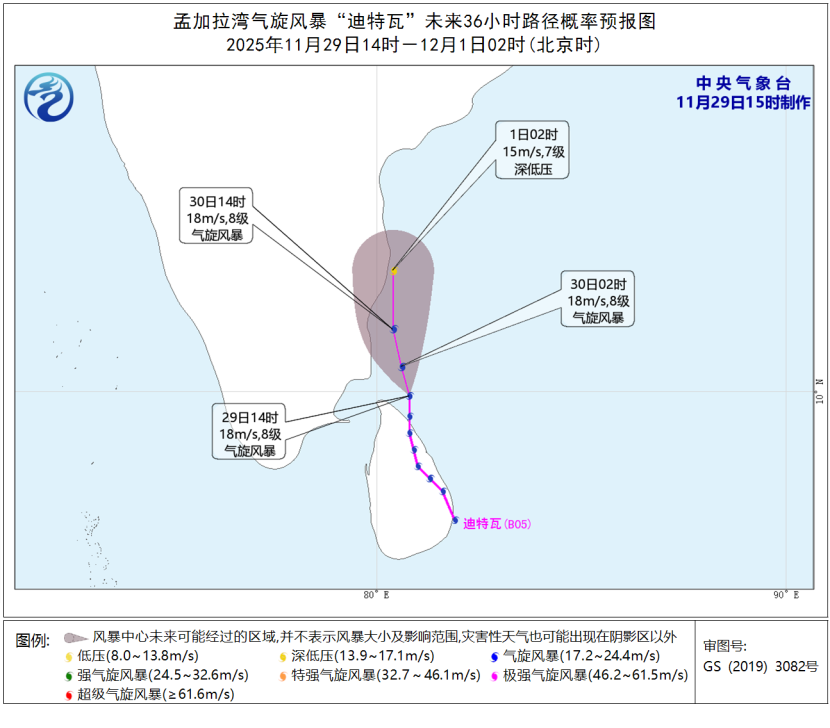 图2 孟加拉湾气旋风暴“迪特瓦”未来36小时路径预报图