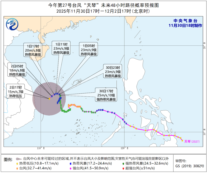 预计,“天琴”将在南海西部海面回旋少动,12月1日白天开始向西南方向缓慢移动,强度逐渐减弱,2日夜间在南海西南部海域减弱消散。