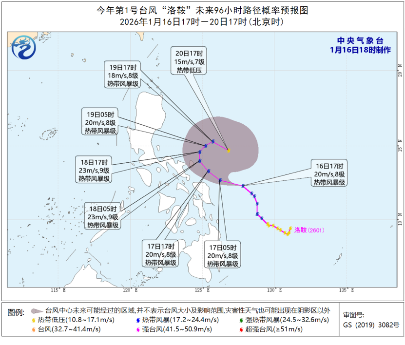 今年第1号台风“洛鞍”(热带风暴级)的中心今天(16日)下午5点钟(北京时,下同)位于菲律宾马尼拉东偏南方向约780公里的洋面上,就是北纬12.3度、东经127.8度,中心附近最大风力有8级(20米/秒),中心最低气压为995百帕,七级风圈半径150-300公里。