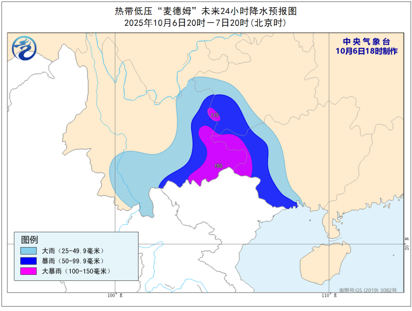 降水预报:6日20时至7日20时,广西西部、贵州西部、云南东部和南部等地有大到暴雨,部分地区有大暴雨(100~150毫米);上述部分地区伴有短时强降水,最大小时降雨量20~40毫米,局地可超过50毫米。
