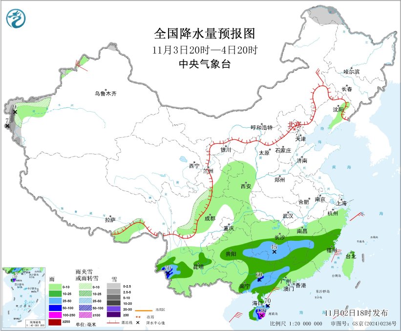11月2日夜间至4日,西南地区、江南、华南等地有一次明显降水过程,其中,云南中北部、四川南部、贵州中南部、湖南南部、江西南部、广西东部、广东西部、海南岛等地部分地区有大雨,云南中西部、海南岛中东部局地有暴雨或大暴雨。此外,2日夜间至3日,西藏东部、川西高原、青海东南部等地部分地区有小到中雪或雨夹雪,高海拔地区局地有大到暴雪,新增积雪深度2~4厘米,局地6~10厘米。