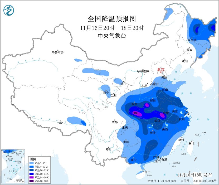 图1全国降温预报图(11月16日20时-19日08时)