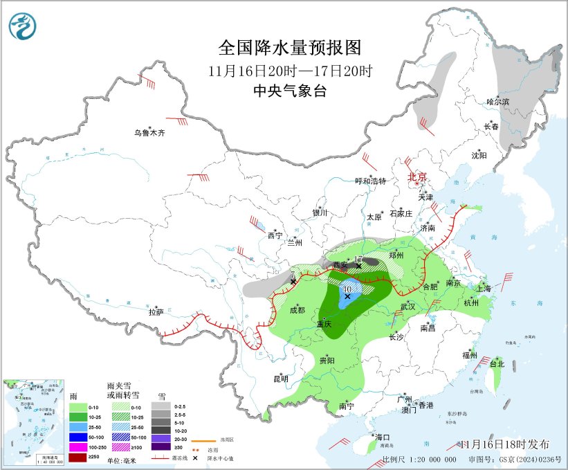 11月16日20时至17日20时,内蒙古东北部、东北地区东北部、川西高原北部、甘肃南部、陕西中南部、河南西部、湖北西部、重庆北部等地部分地区有小到中雪或雨夹雪,其中,陕西南部、河南西部、湖北西北部、重庆北部等地部分地区有大到暴雪(10~17毫米),新增积雪深度5~10厘米,局地可超过15厘米;黄淮西部、江淮大部、江汉、江南北部、西南地区东部、广西西部、云南东南部等地部分地区有小到中雨,其中,陕西东南部、重庆北部、湖北西部等地部分地区有大雨(25~40毫米)。新疆北部、青海东部和南部、内蒙古中东部、东北地区东部、华北北部和东部、黄淮东部、江淮、江汉、江南北部、浙闽沿海等地的部分地区有5~6级风、阵风7~9级的大风;渤海、渤海海峡、黄海大部、东海大部、台湾海峡将有7~8级、阵风9~10级的大风,其中东海西南部的部分海域风力可达9级、阵风10~11级,南海北部和中部有7级、阵风8级的大风(见图4)。