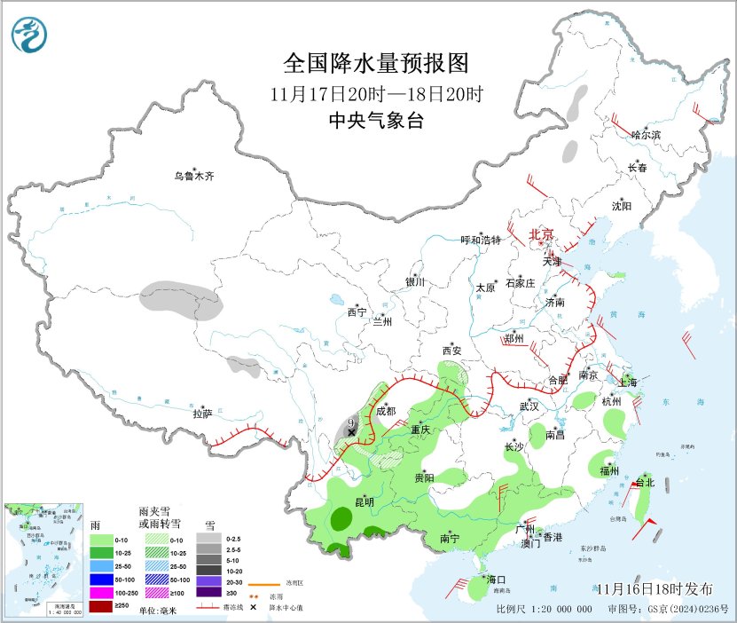 图4 全国降水量预报图(11月16日20时-17日20时)
